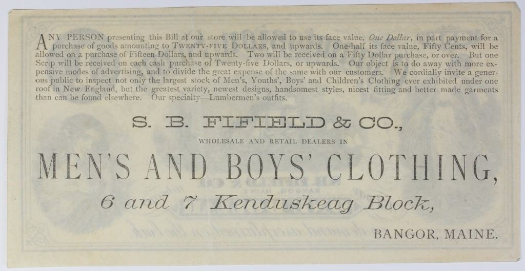 BANGOR, MAINE. MENS AND BOYS CLOTHING. XF. ESTIMATE: $150-$200