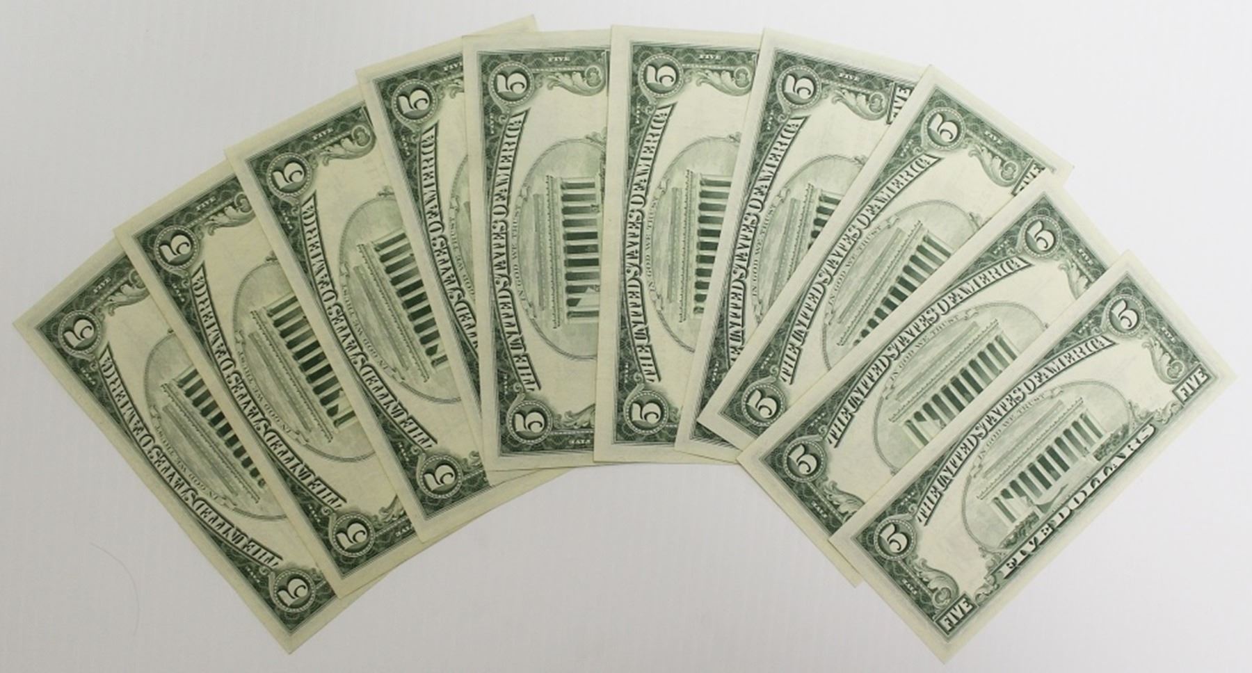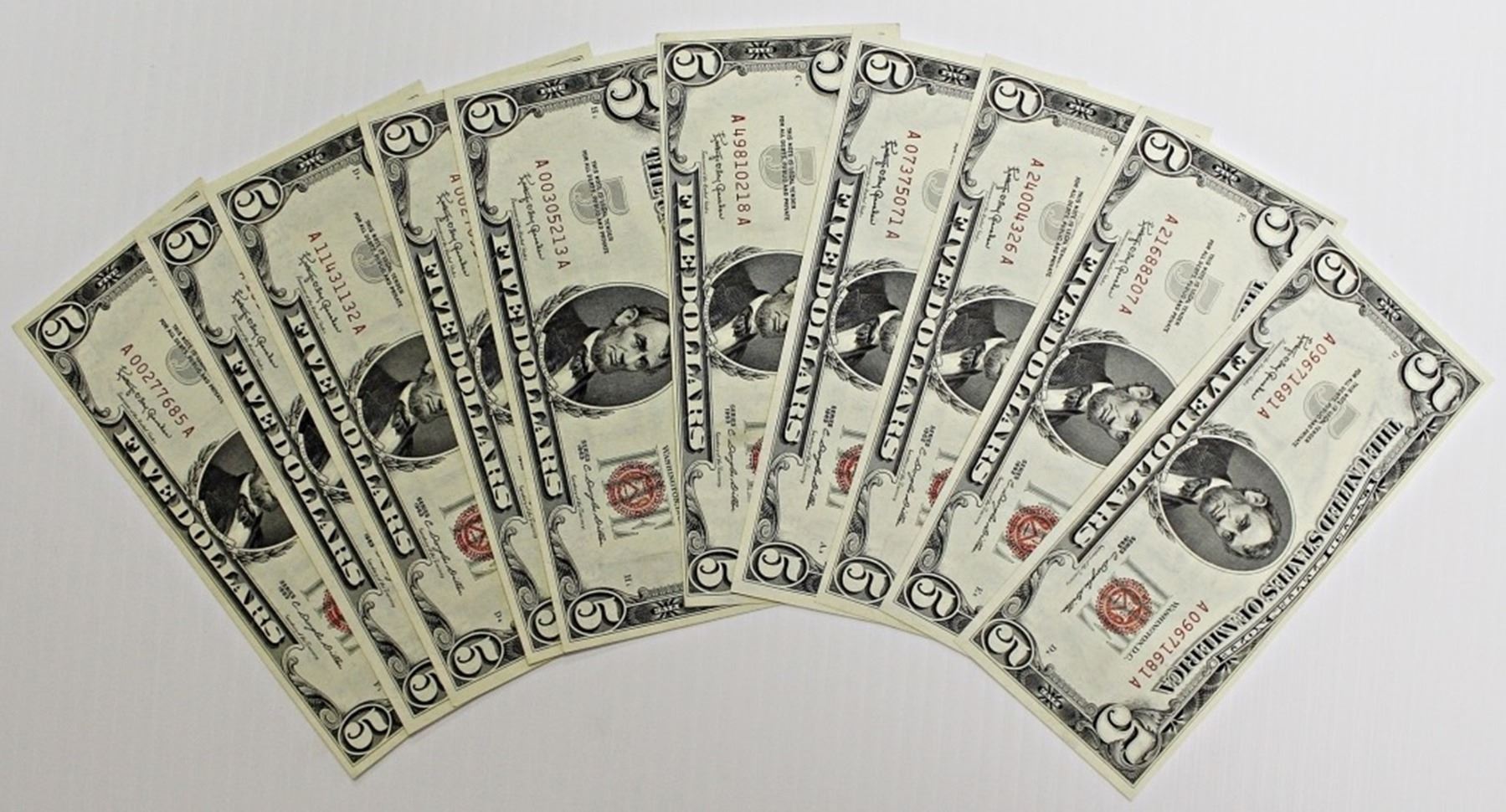 10 PCS. 1963 $5.00 UNITED STATES NOTES