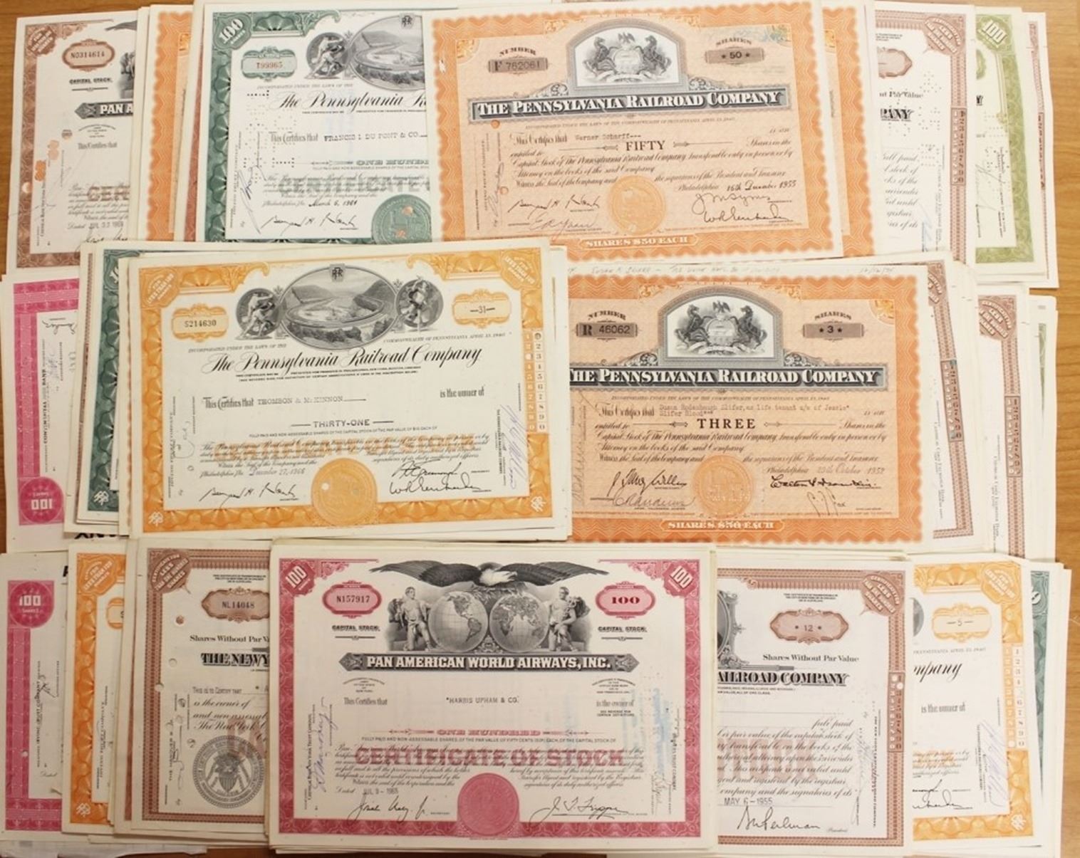 CERTIFICATES XF+. COLORFUL AND NEAT LOOKING. INTERESTING! VARIOUS DATES. WHO KNOWS WHATS ALL HERE? WE ONLY COUNTED THEM! ESTIMATE: $200-$250