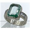 10KT WHITE GOLD RING SET WITH 6 RADIANT CUT SYNTHETIC WHITE STONES MEASURING 3.5 X 2.2. CENTER STONE IS 14 X 10 MM EMERALD CUT. SYNTHETIC GREEN STONE. MOUNTING WEIGHS 10.1 GRAMS. ESTIMATE: $900-$1000