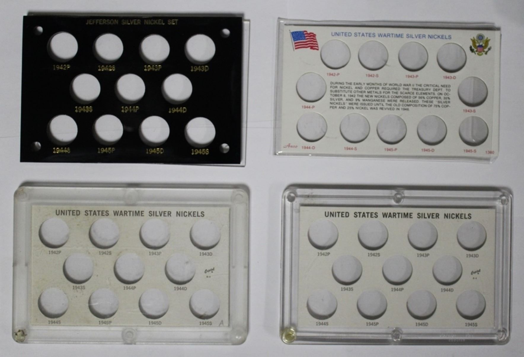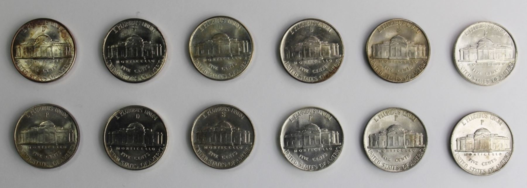 ALL GEM BU. 1942 S & P, 1943 - P, S, AND D, 1944 - P, S, AND D, (2) 1945-P, (2) 1945-D, PLUS (5) SILVER NICKEL SET HOLDERS, TWO CAPITOL PLASTIC. ESTIMATE: $175-$250