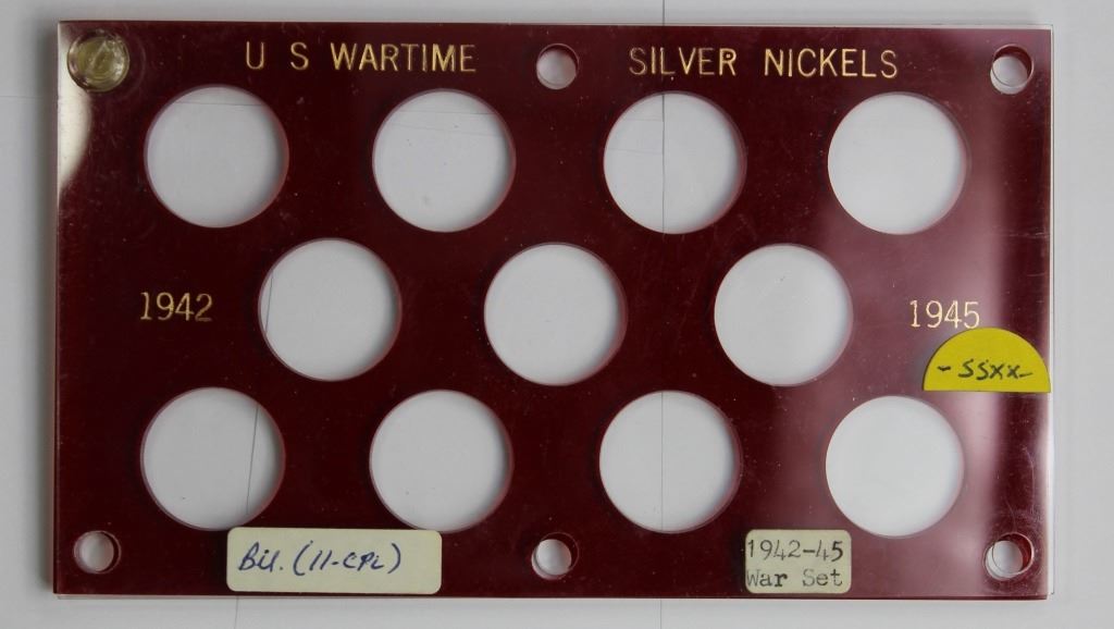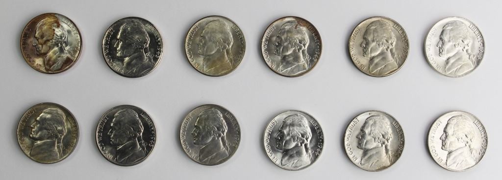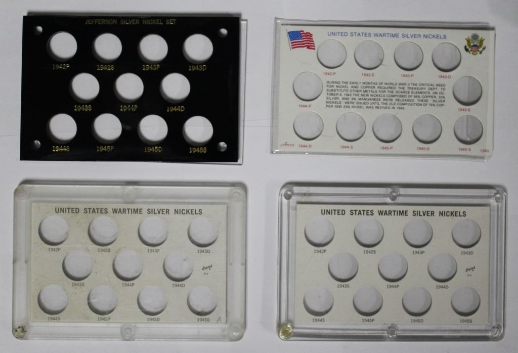 ALL GEM BU. 1942 S & P, 1943 - P, S, AND D, 1944 - P, S, AND D, (2) 1945-P, (2) 1945-D, PLUS (5) SILVER NICKEL SET HOLDERS, TWO CAPITOL PLASTIC. ESTIMATE: $175-$250