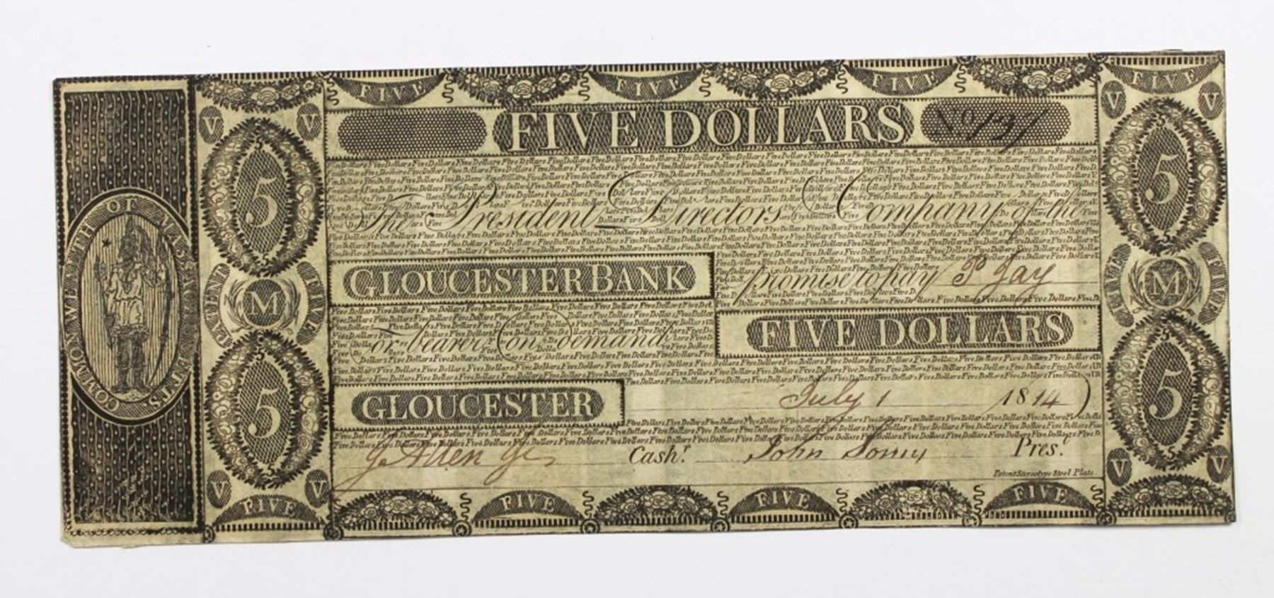 1814 $5 GLOUCESTER BANK, MASS. QUITE RARE