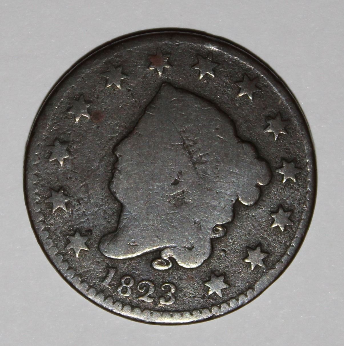 1823 LARGE CENT, KEY COIN, NICE G-VG, NICE COLOR! ESTIMATE: $200.-$250.00