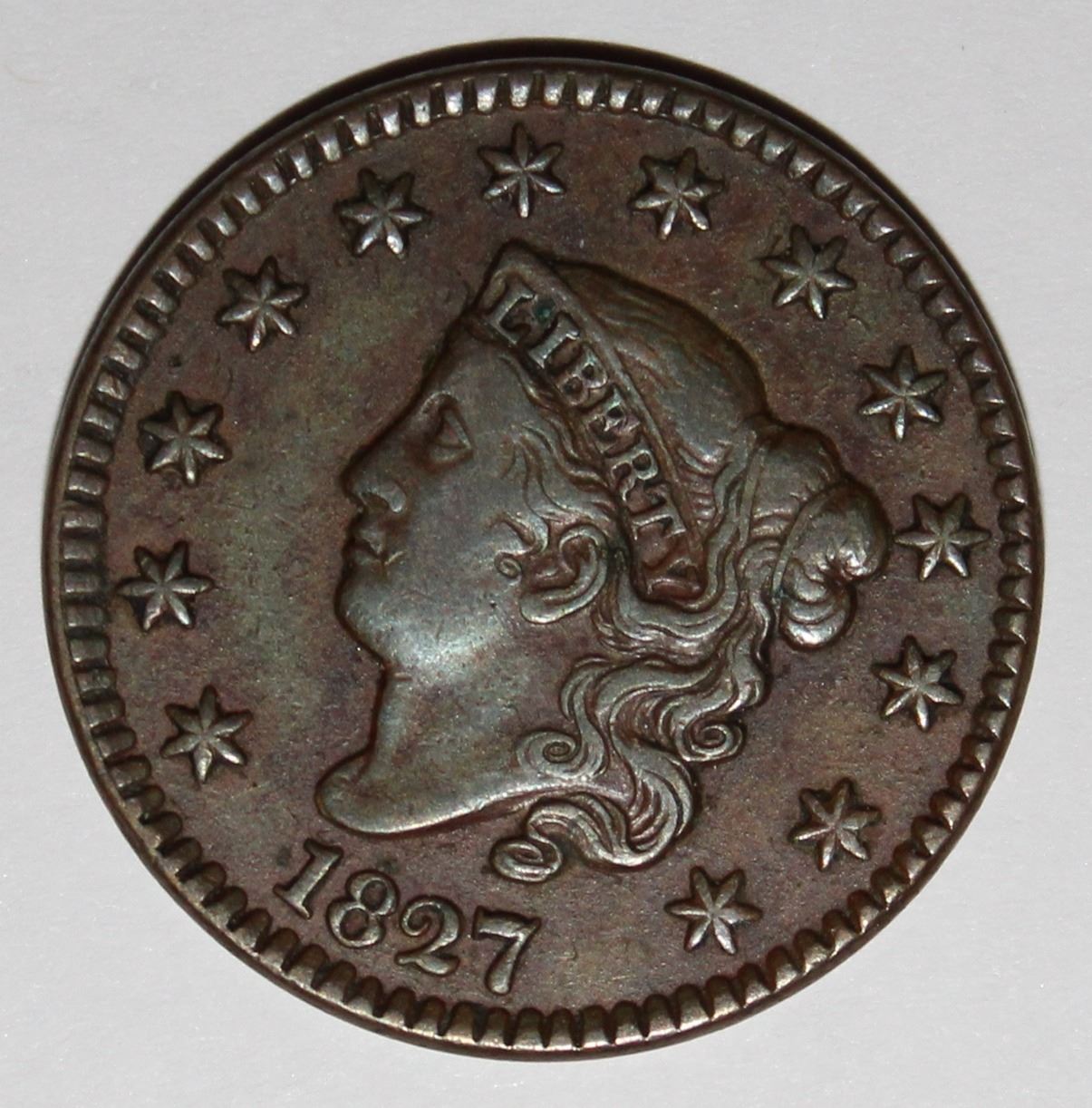 1827 LARGE CENT, SCARCE DATE, XF BEAUTIFUL COLOR. ESTIMATE: $200.-$250.00