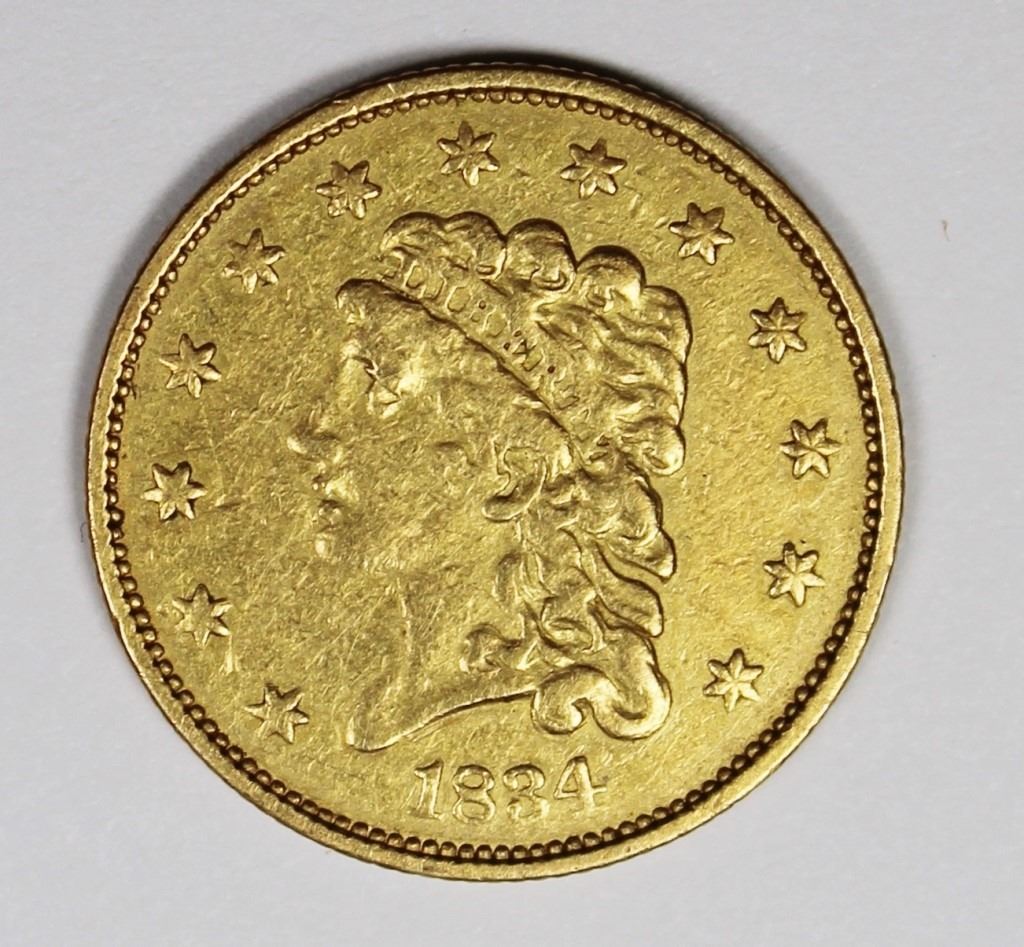 1834 $2.50 GOLD CLASSIC HEAD CH XF/AU. GOOD INVESTMENT! VERY NICE COIN! ESTIMATE: $775-$850