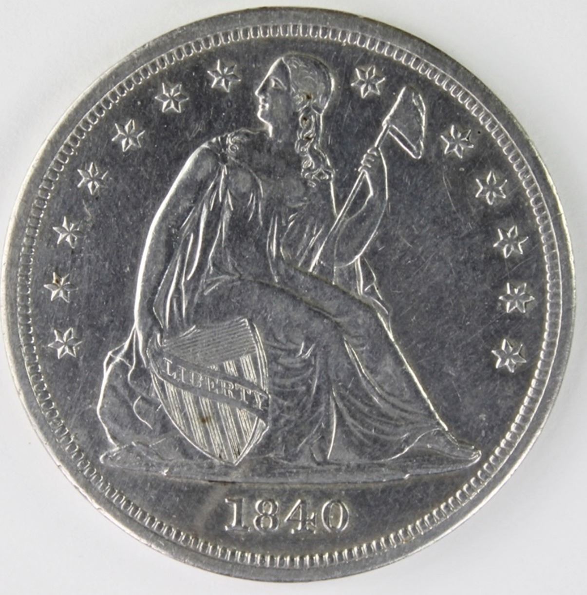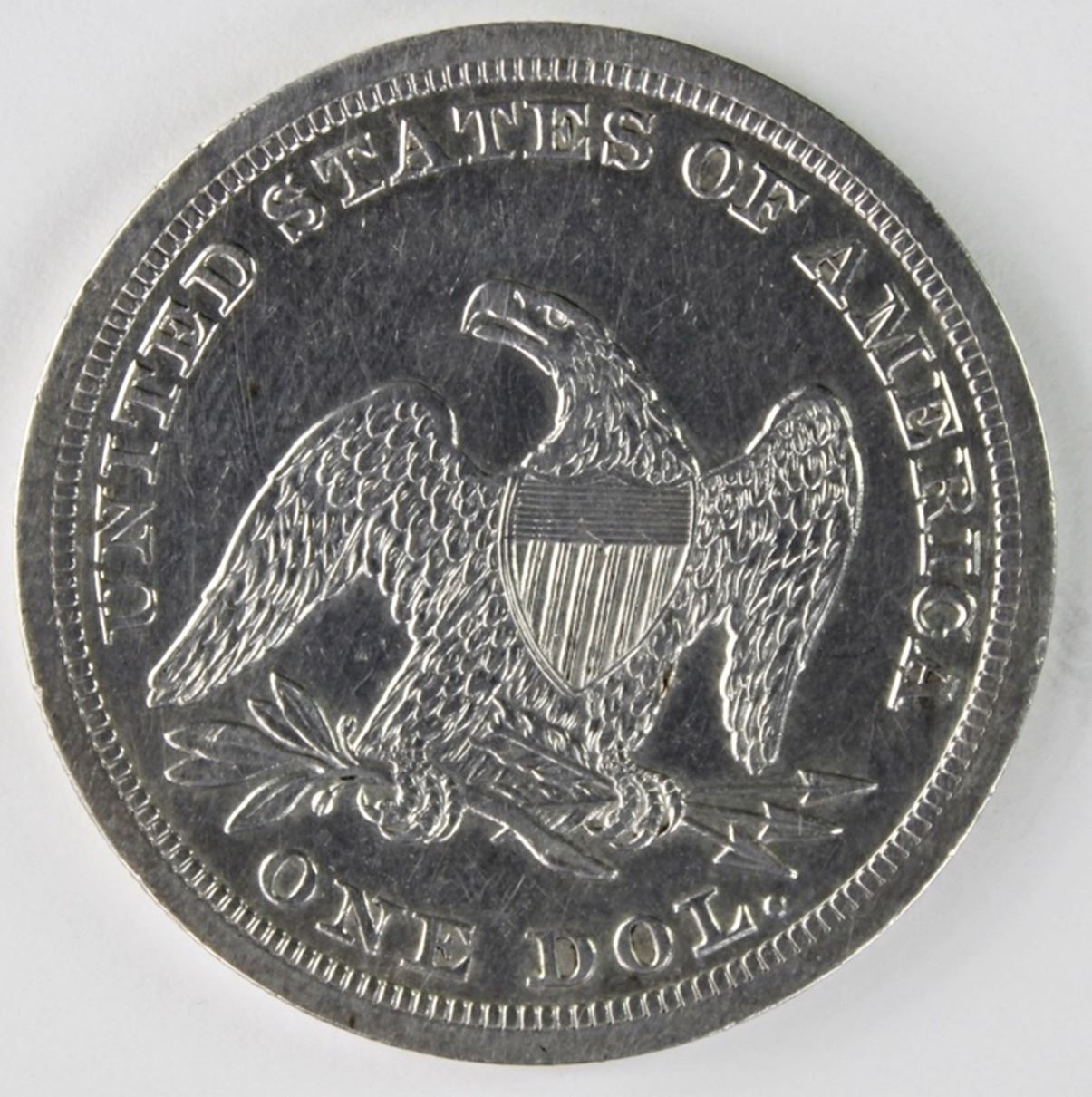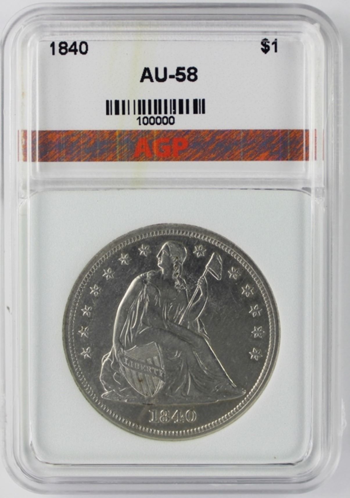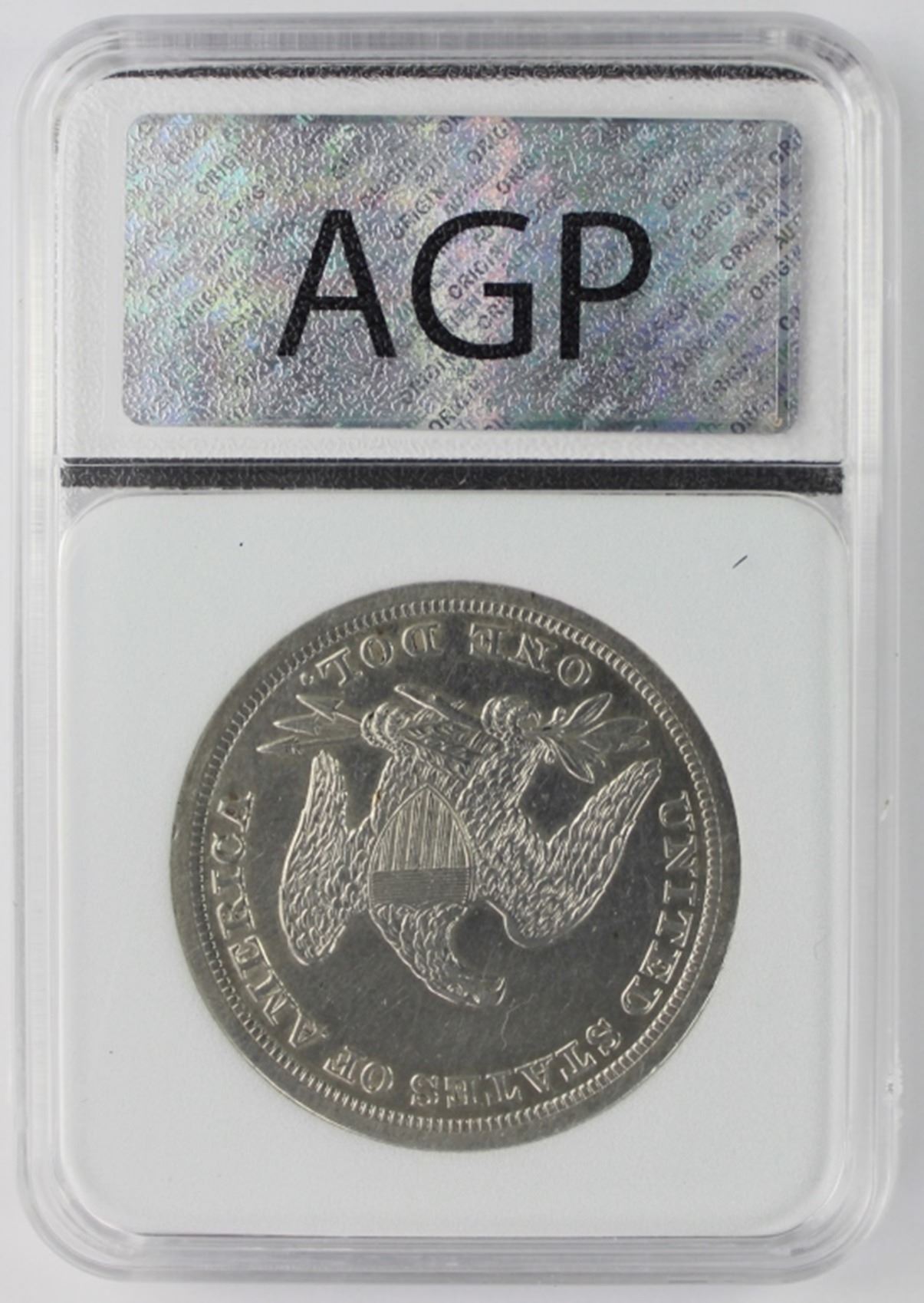 AU/UNC AGP GRADED FROM OUR SEATED DOLLAR COLLECTION CONSIGNED! NICE WHITE SURFACES AND VERY NICE! ESTIMATE: $3750-$4000