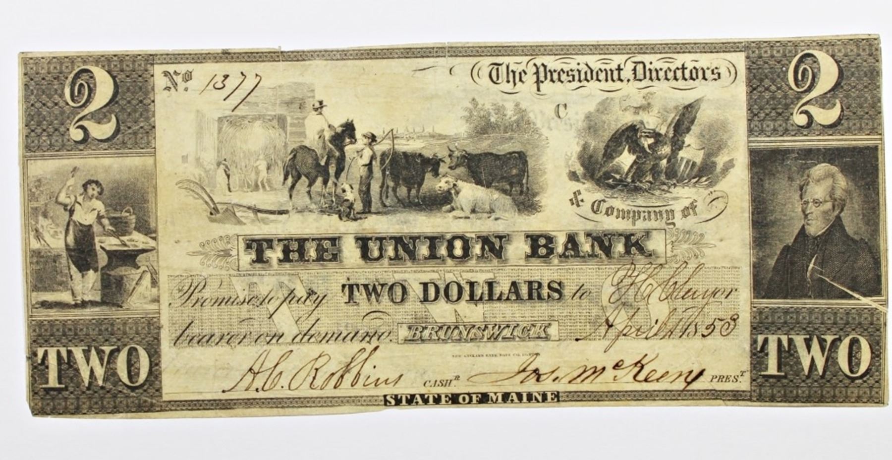 1858 $2 UNION BANKD BRUNSWICK, MAINE