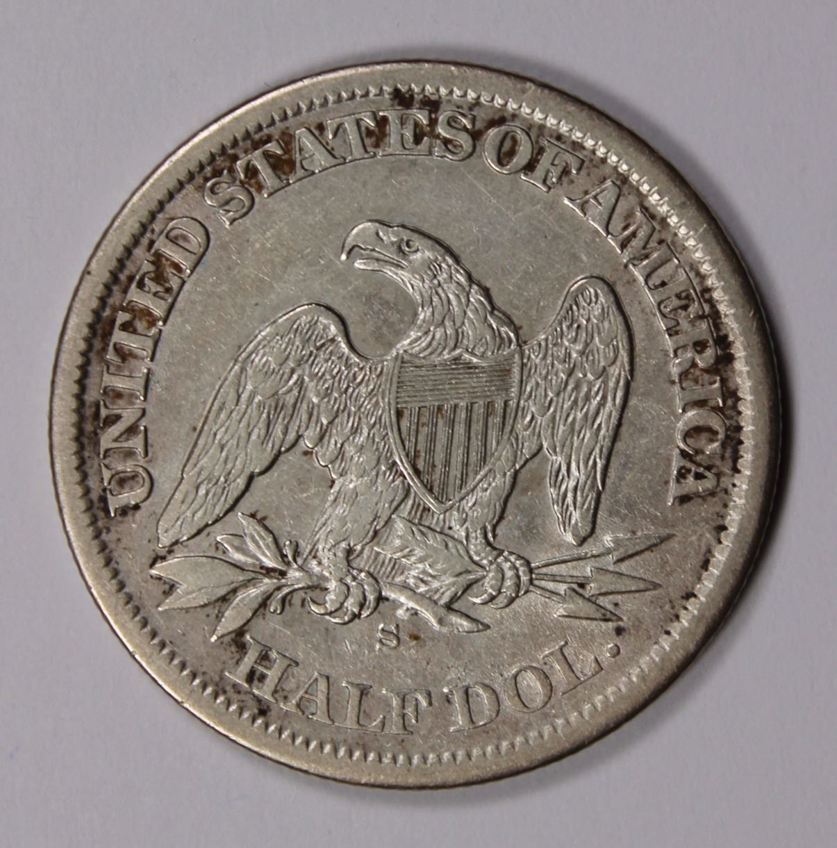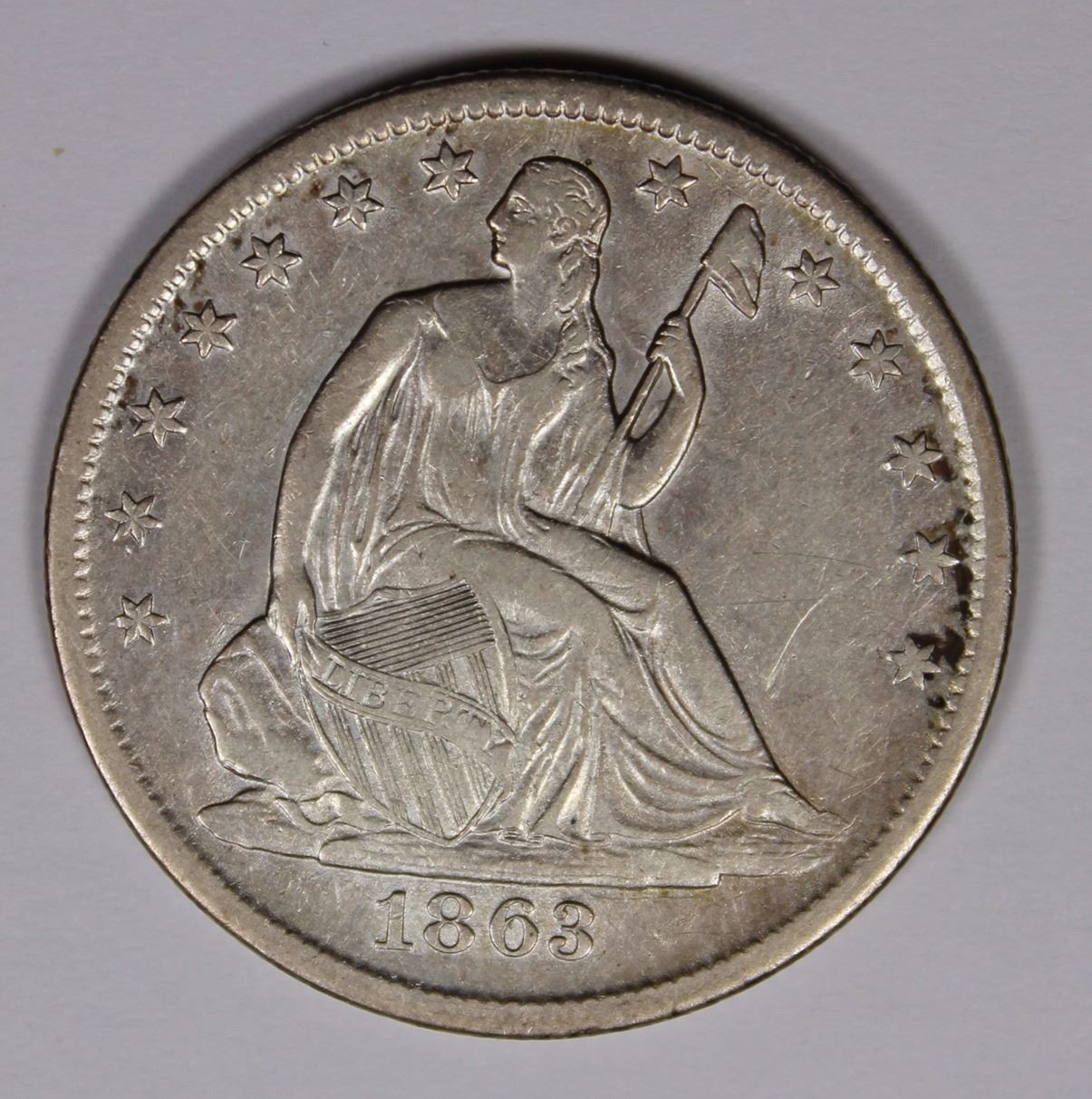1863-S LIBERTY SEATED HALF DOLLAR, NEAR AU CIVIL WAR COIN, RARE! DESIRABLE AS A COIN AND CIVIL WAR COLLECTIBLE! ESTIMATE: $400.- $500.00