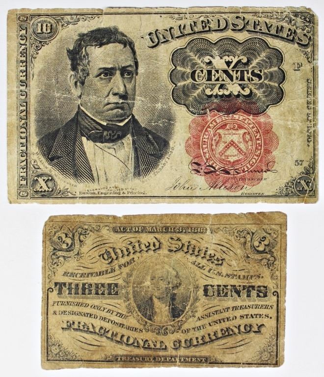 1874 TEN CENT FRACIONAL AND THREE CENT THIRD ISSUE CIRCS. ESTIMATE: $75-$100