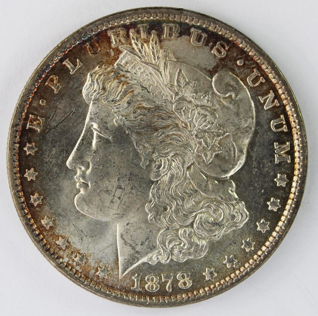 BGC SUPERB BU MOSTLY WHITE RAINBOW COLORS AROUND THE RIMS! VERY PRETTY COIN. ESTIMATE: $6000-$7000