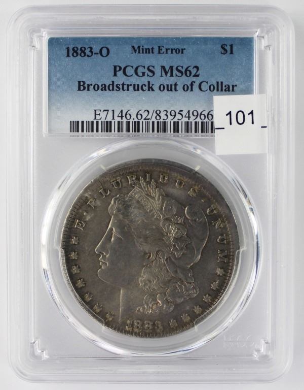 PCGS MS62. RARE MINT ERROR. BROADSTRUCK OUT OF COLLAR! MINT ERROR MORGANS ARE RARE! ESTIMATE: $2500-$3000