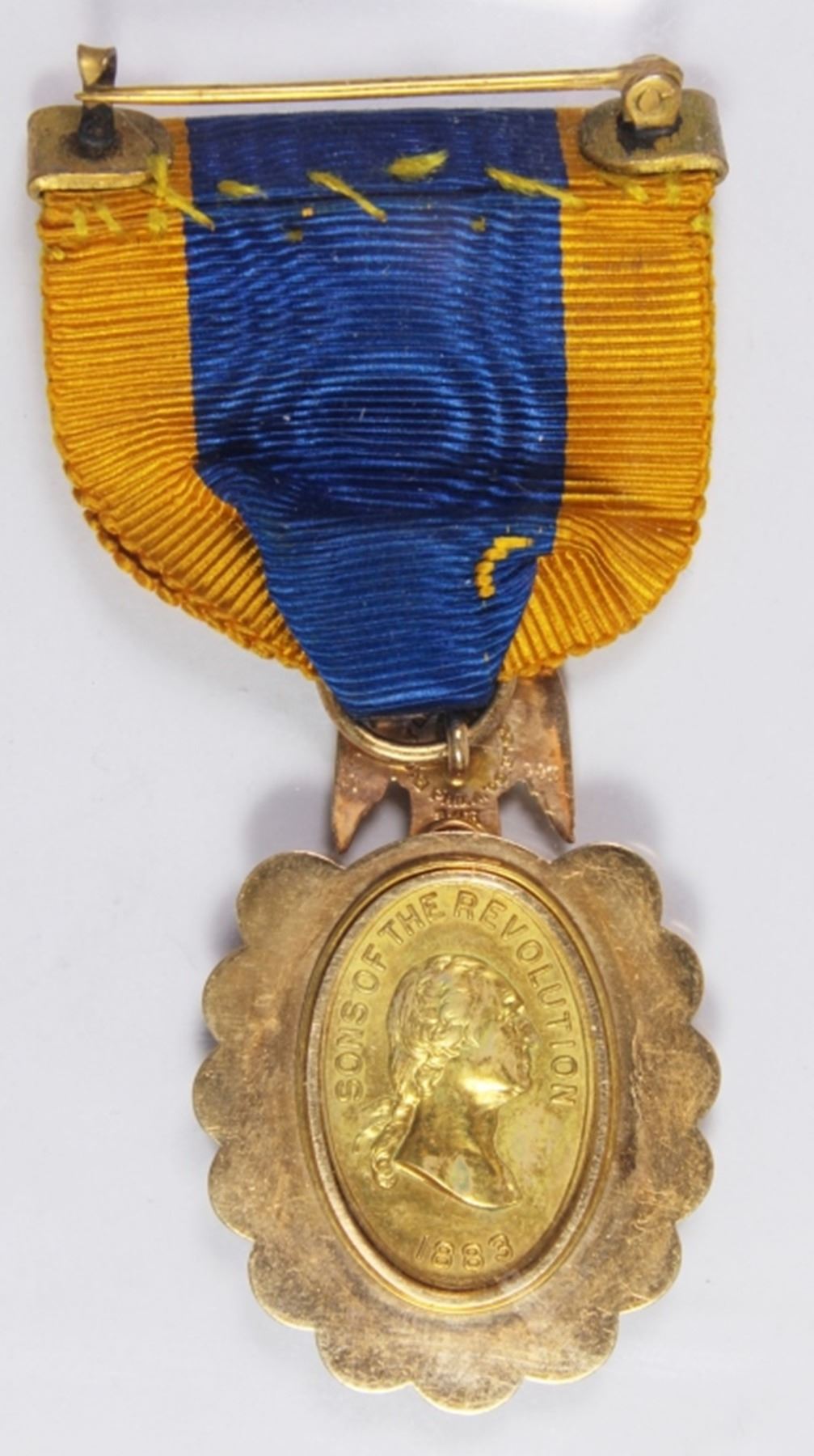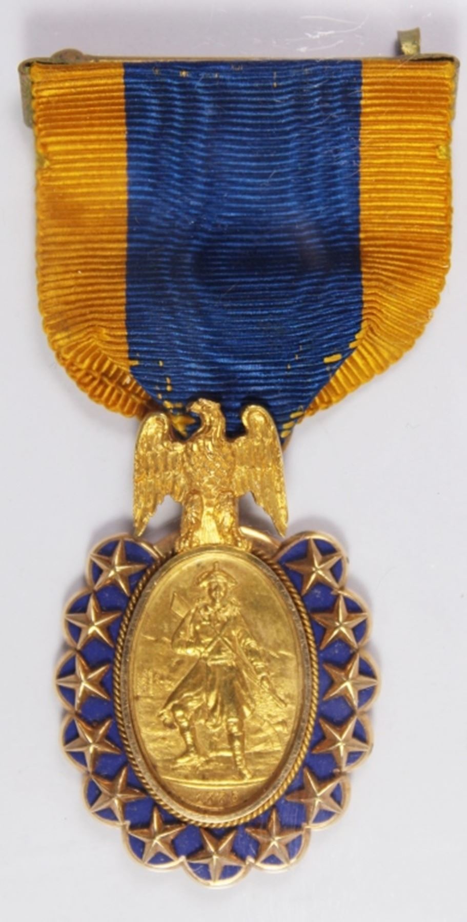 WITH THE OVAL GOLD METAL PORTION MEASURING 44MM X 30MM PLUS ITS BOLD GOLD AND SILK. RIBBON EXTENDS FULLY TO ABOUT 3 1/2" OR 78MM TALL. VERY CHOICE AU. A RARE AND DESIRABLE ITEM PRODUCED BY BAILEY BANKS AND BIDDLE #3597. ESTIMATE: $1000-$1250