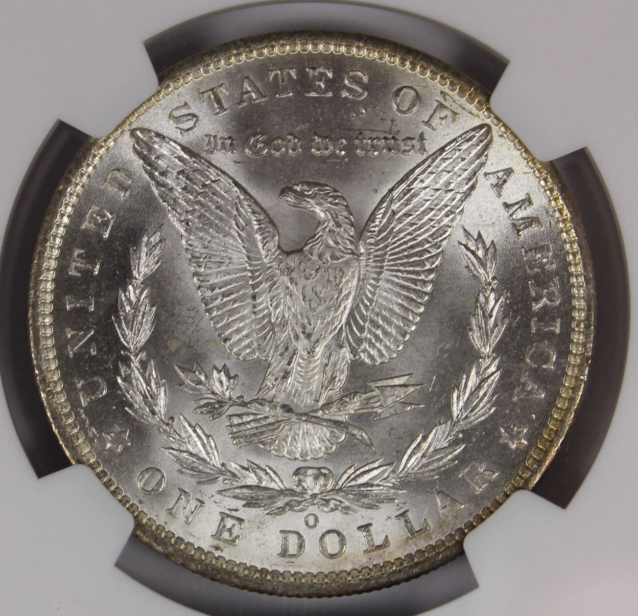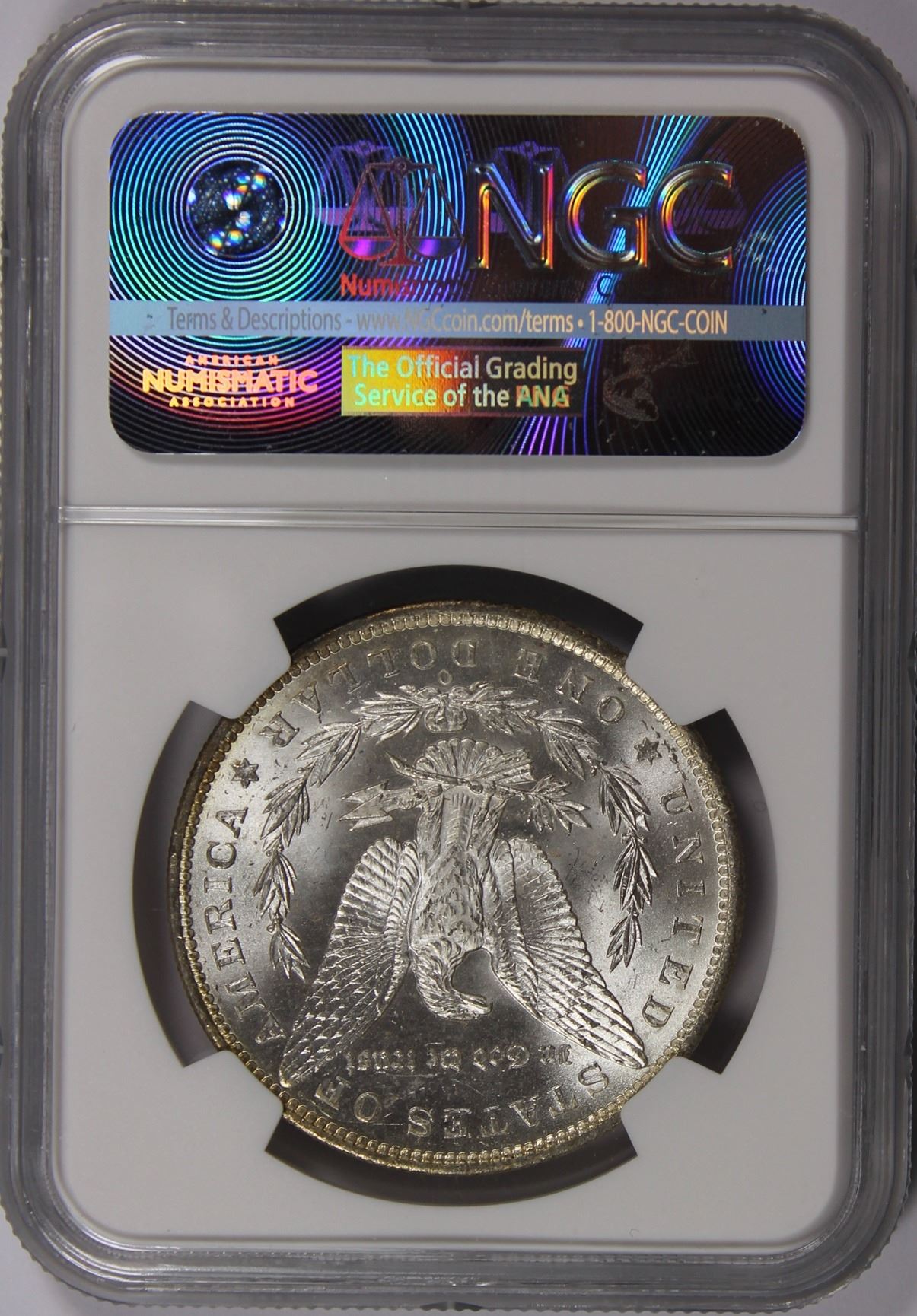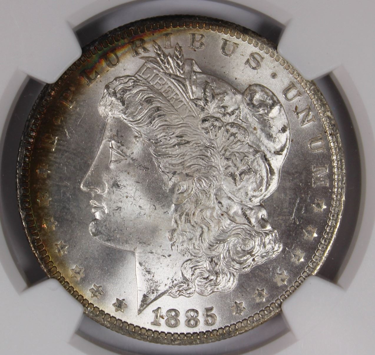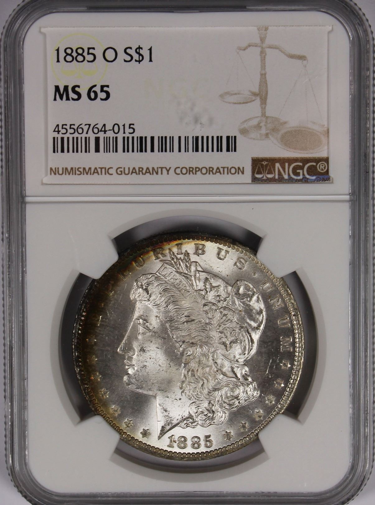 1885-O MORGAN SILVER DOLLAR NGC MS-65 WHITE WITH A LITTLE RIM RAINBOW COLOR! ESTIMATE: $135-$175