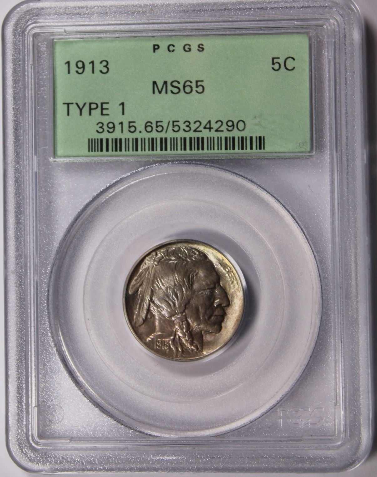 1913 TYPE 1 BUFFALO NICKEL PCGS MS 65. GREEN LABEL. GEM SUPER COIN! ESTIMATE: $150-$200