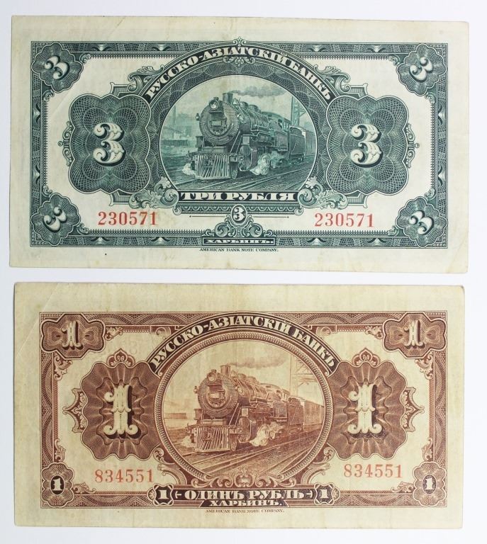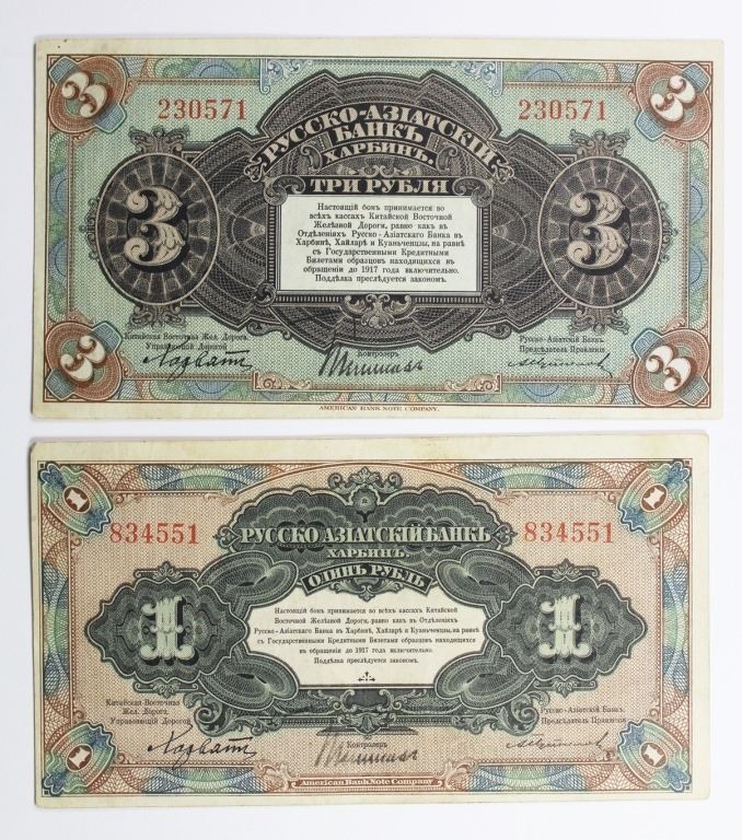 1 ROUBLE, 3 ROUBLE. RUSSO-ASIANC. BANK. BOTH VF-XF. HARBIN S#474A. ESTIMATE: $200-$250