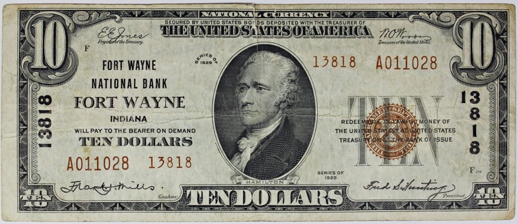 1929 $10.00 FT. WAYNE, IN. BANK #13818