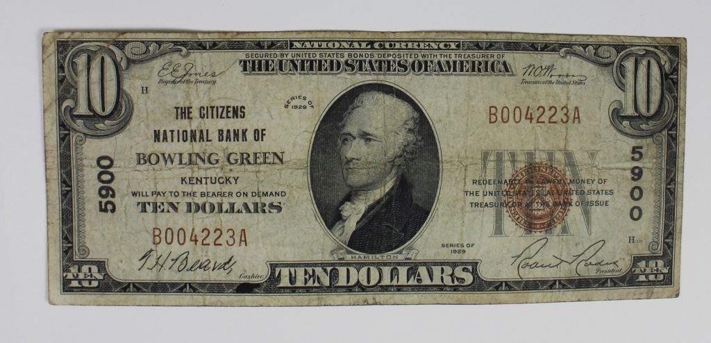 1929 $10 NATIONAL BOWLING GREEN, KY 1929 $10 NATIONAL BOWLING GREEN, KY CIRCULATED. ESTIMATE: $75-$1
