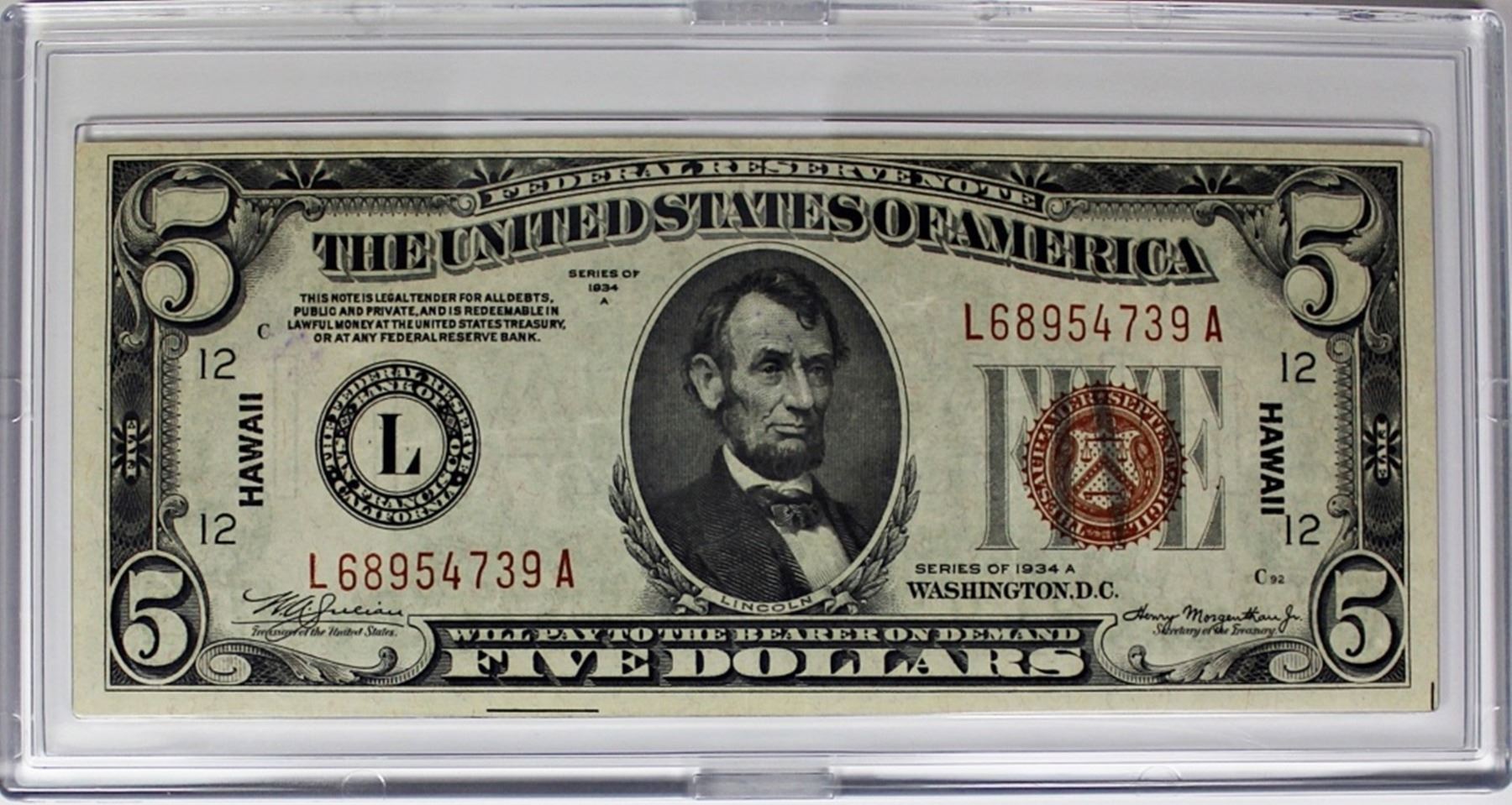 1934 A $5.00 HAWAII SILVER CERTIFICATE