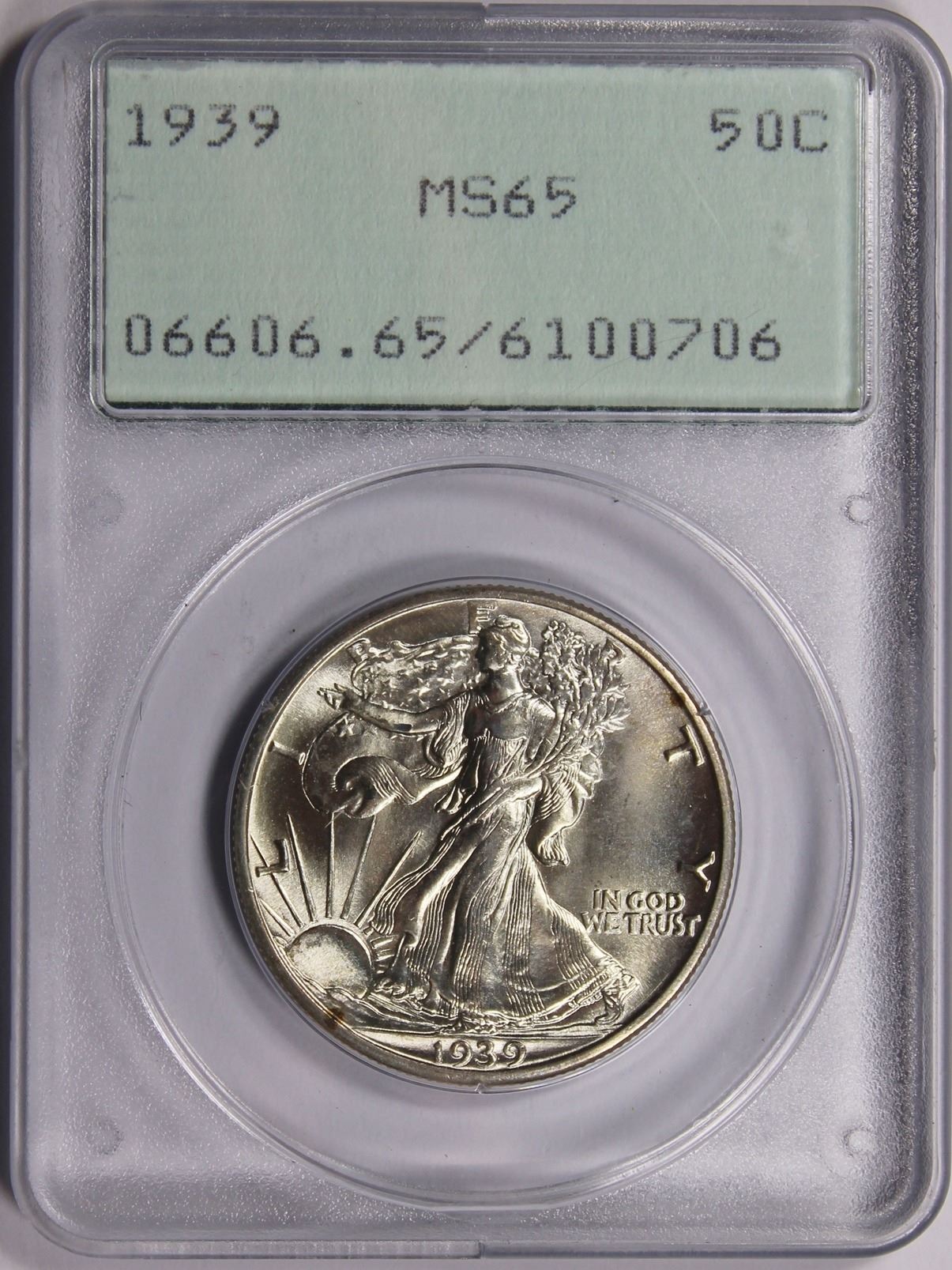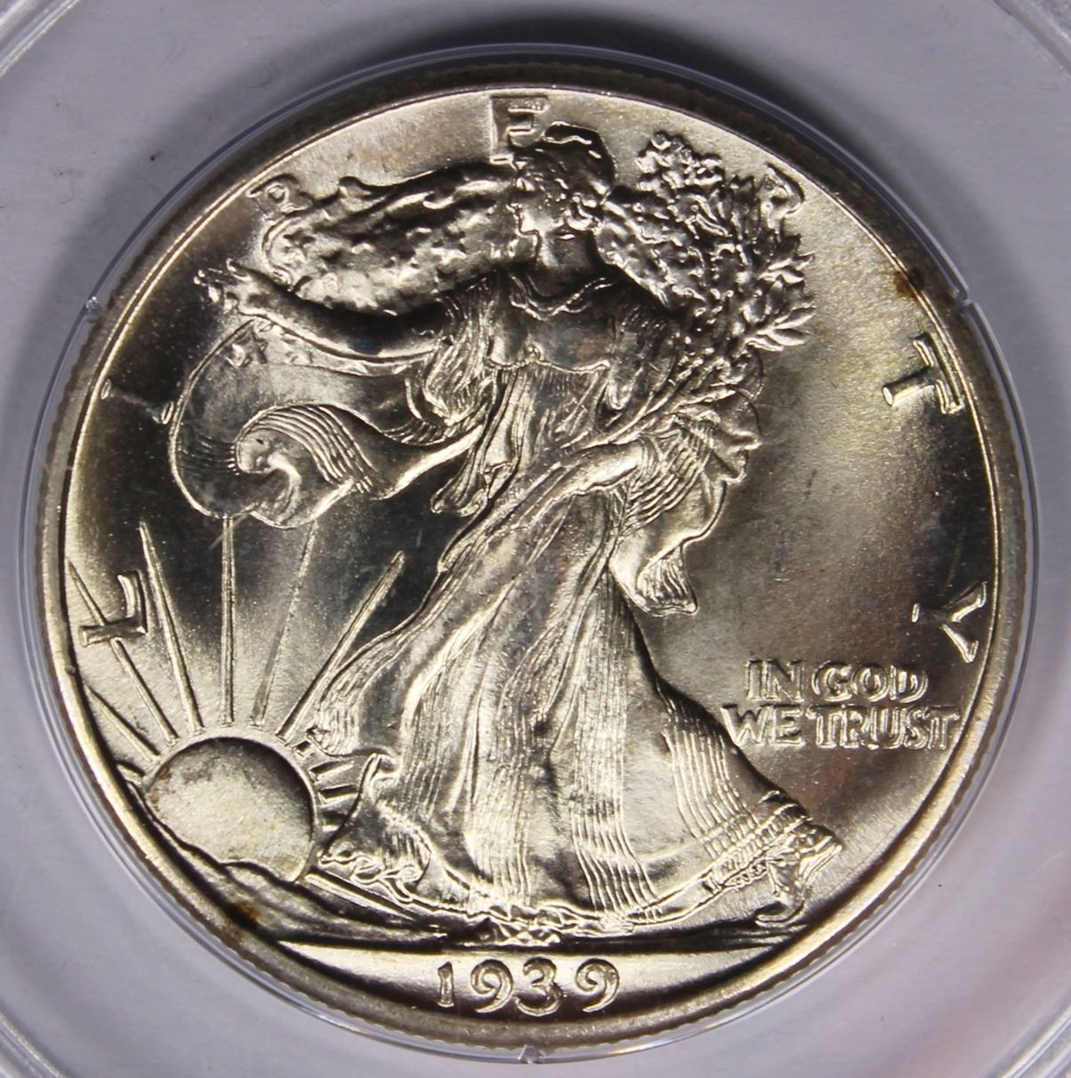 1939 WALKING LIBERTY PCGS MS65 GEM SNOW WHITE! RATTLER HOLDER THAT LOOKS MS66 OR BETTER. ESTIMATE: $200-$250