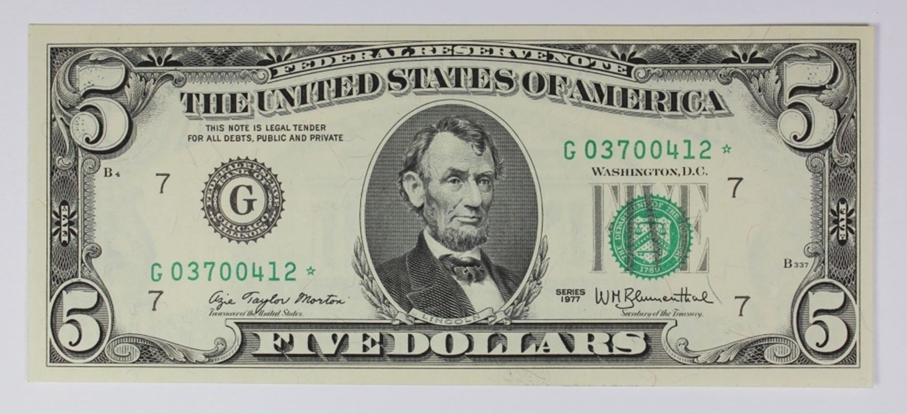 1977 $5.00 CHICAGO FEDERAL RESERVE  STAR  NOTE