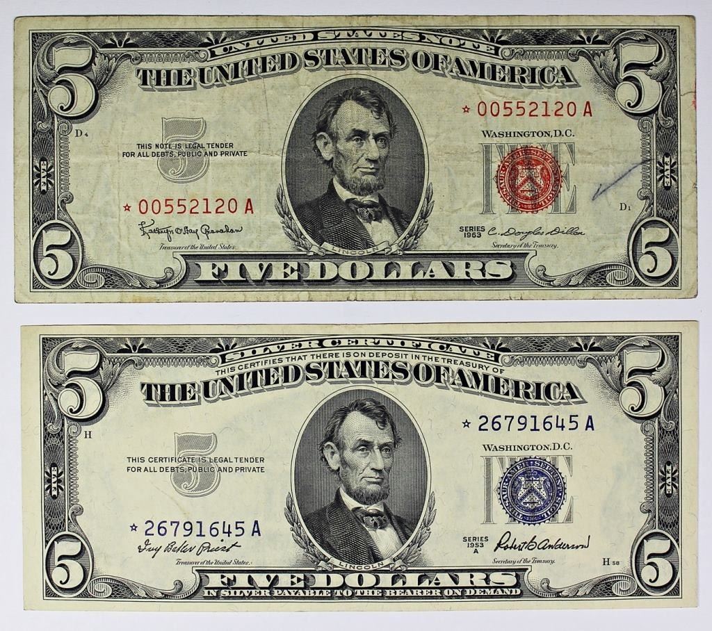 1963 U.S. NOTES VF STAR NOTE; 1953-A SILVER CERTIFICATE STAR NOTE XF-AU. ESTIMATE: $75-$100
