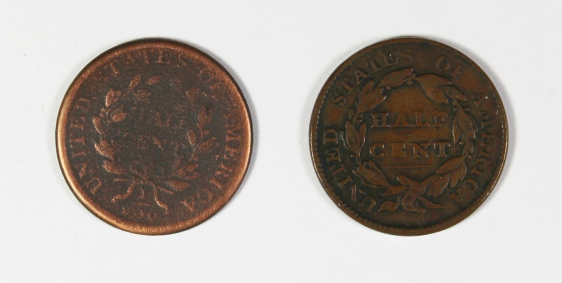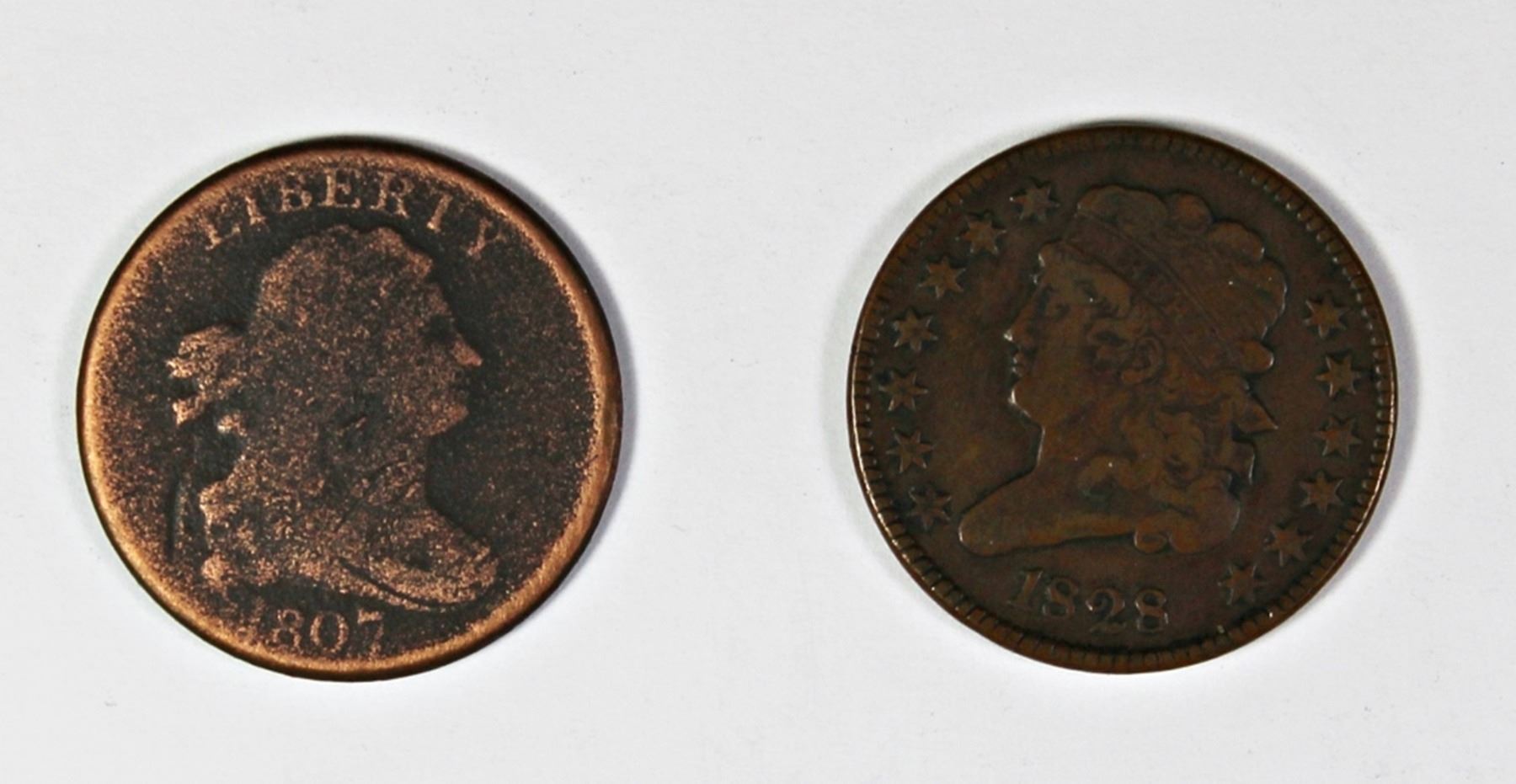 1807 GOOD AND 1828 VF WITH 13 STARS. ESTIMATE: $95-$125
