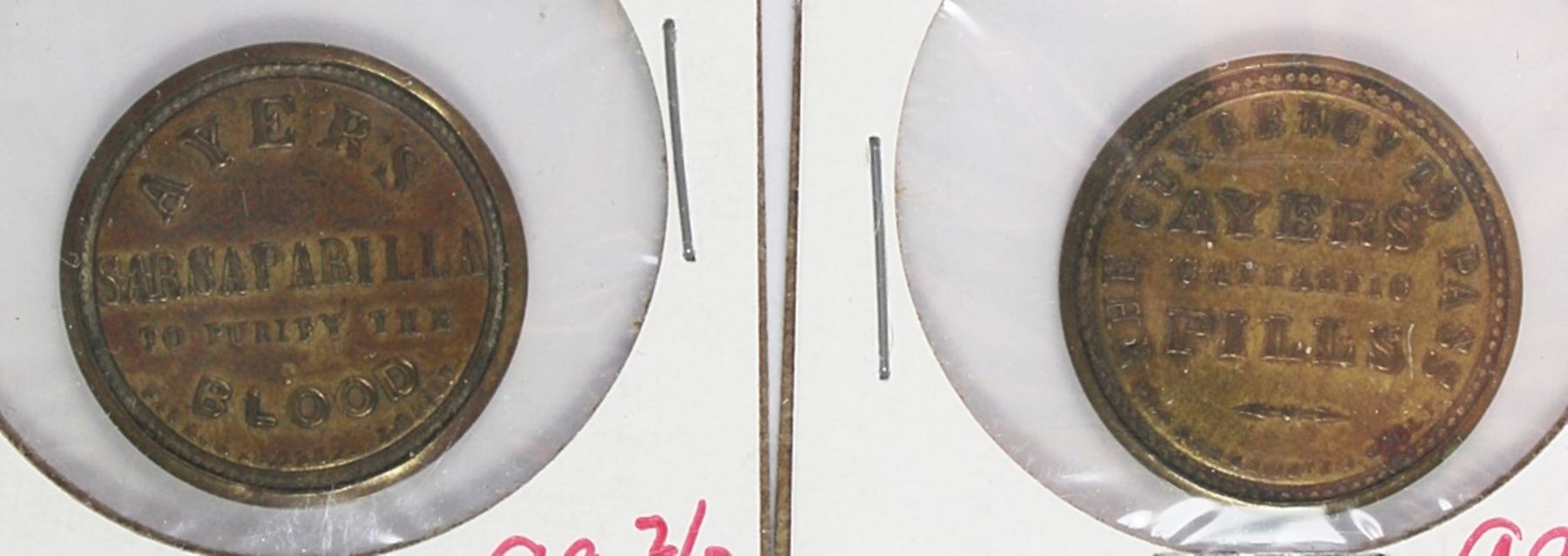 AYERS CATHARTIC PILLS 3 CENTS RED AND AYERS SARSAPARILLA TO PURIFY THE BLOOD1 CENT BLUE WITH LIGHT CRAZING. BOTH CASES ARE XF OR BETTER. ESTIMATE: $1000-$1200