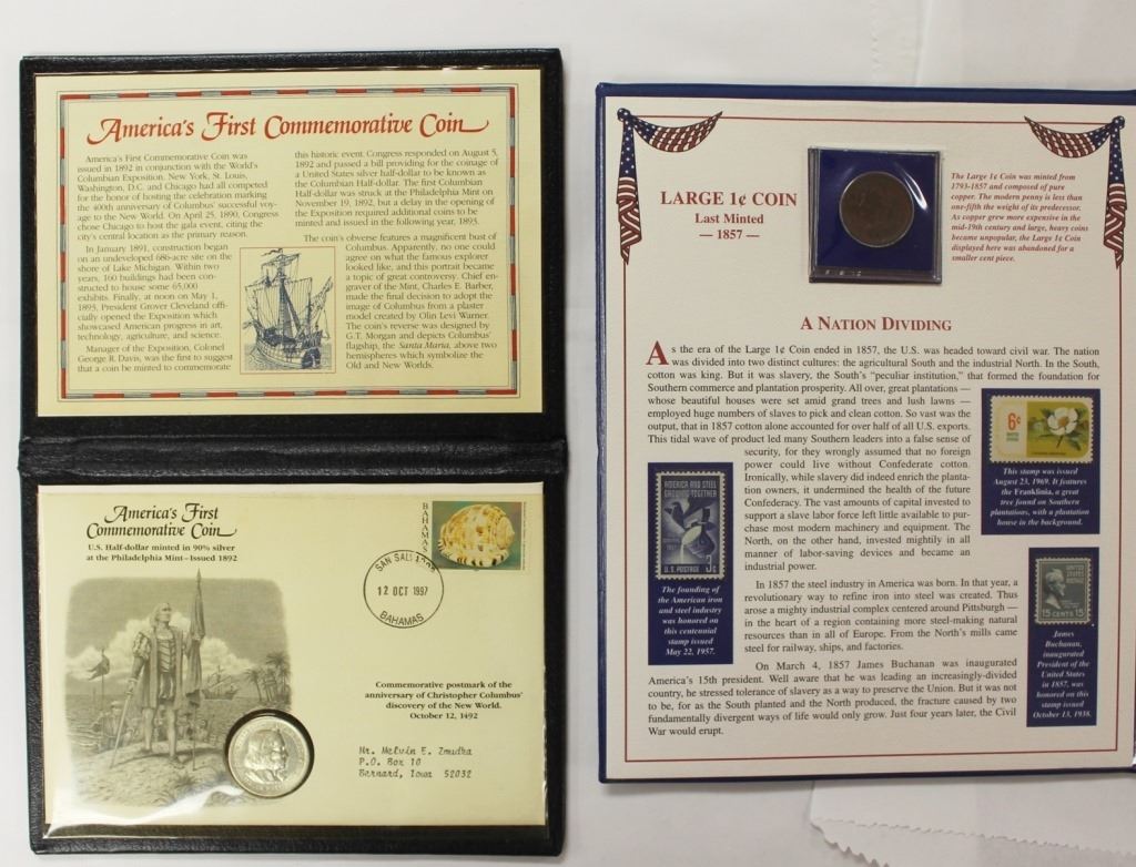 AMERICA'S FIRST COMMEMORATIVE COINS AND 19TH CENTURY AMERICAN COINS. HAS TWO CENT, THREE CENT, LARGE CENT. ALL NICE FINES! ESTIMATE: $100-$150
