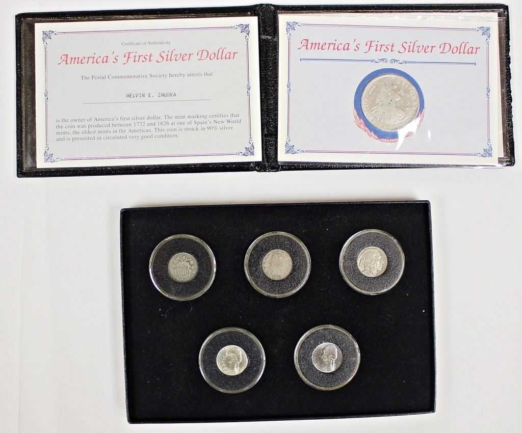 NICKEL SET WITH 1867 SHIELD FINE, 1902, 1936, 1943-D SILVER BU, 2001-D AND AMERICAN'S FIRST SILVER DOLLAR SET AN 1808 MEXICO 8 REALES. ESTIMATE: $100-$150