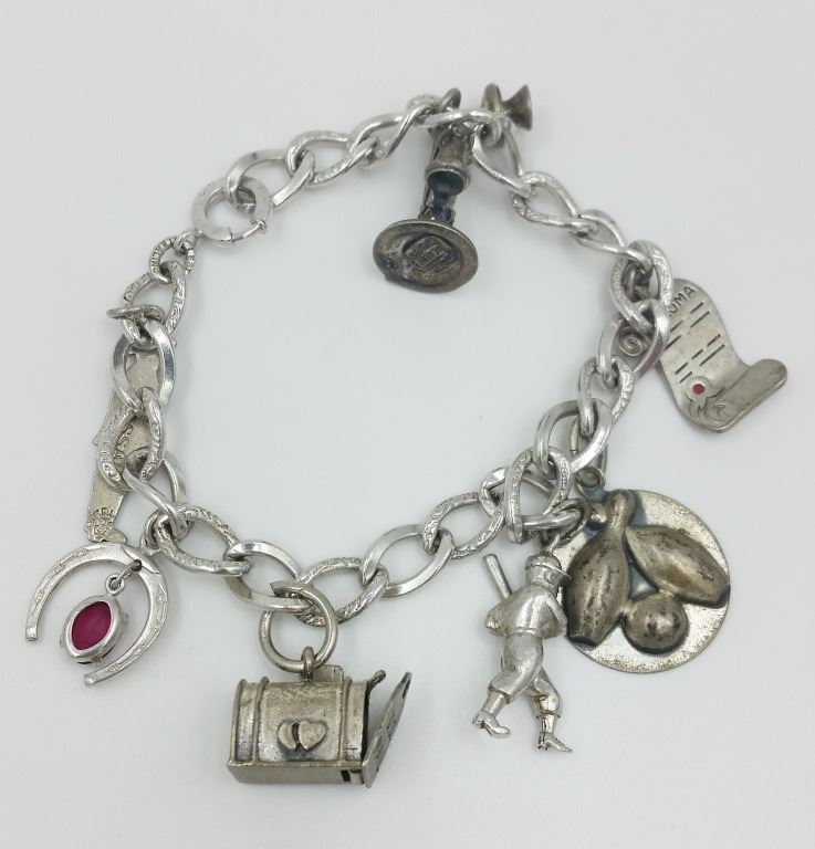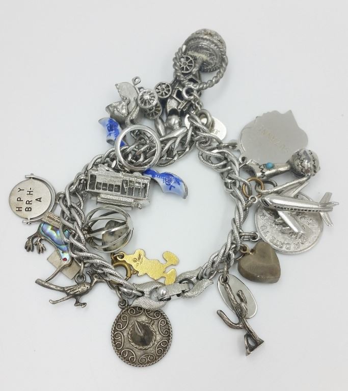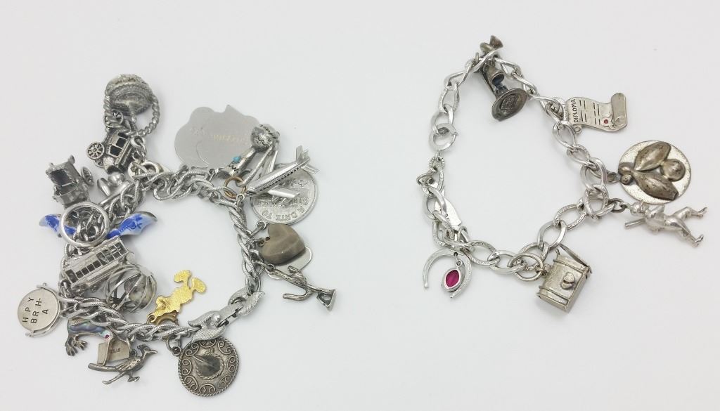 PRE-OWNED, ONE BRACELET HAS CHARMS OF AN AIRPLANE, MICKEY MOUSE, SOMBRERO AND A TROLLY CAR TO NAME A FEW. THE OTHER HAS CHARMS OF A MAILBOX, HORSESHOE AND AN OLD FASHIONED TELEPHONE TO NAME A FEW. SEE PHOTOS! TOTAL