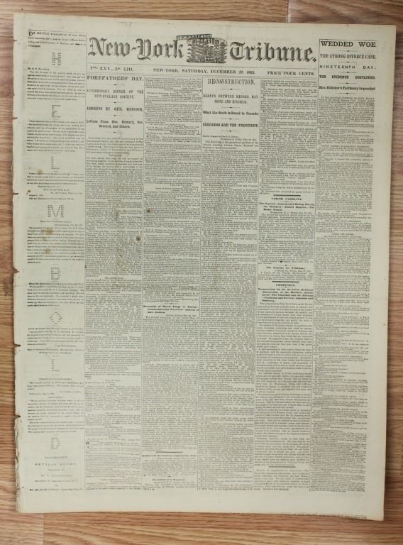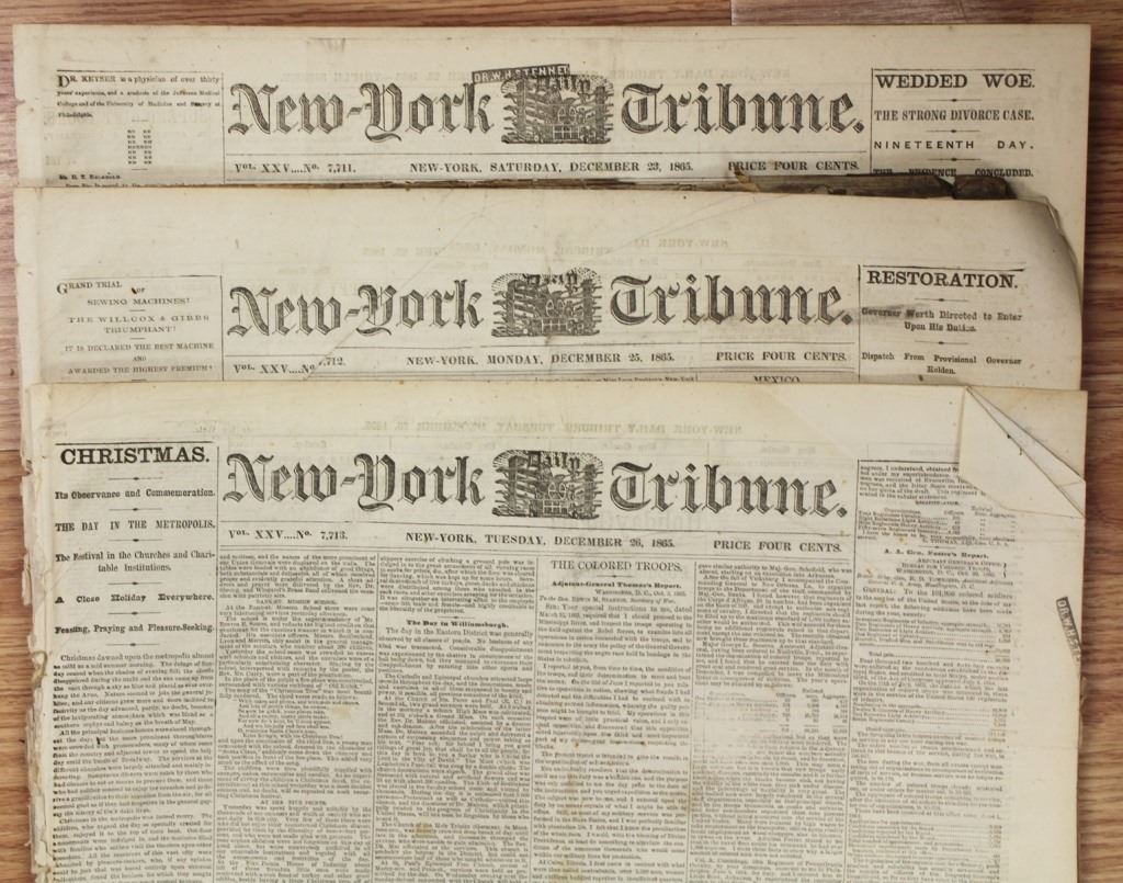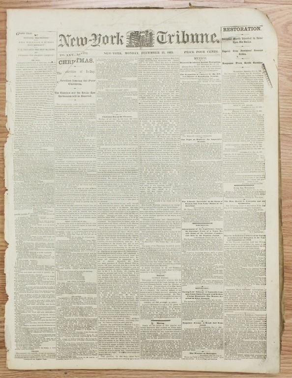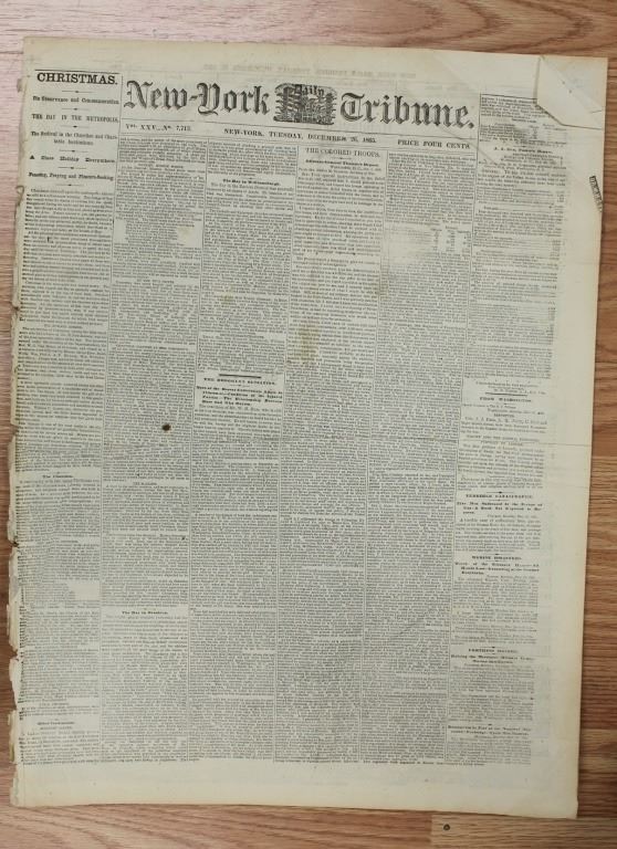 1861-1865. NEW YORK TRIBUNE, 100% AUTHENTIC AND ORIGINAL. WHAT A SUPER CONTENT TO READ! ESTIMATE: $150-$200