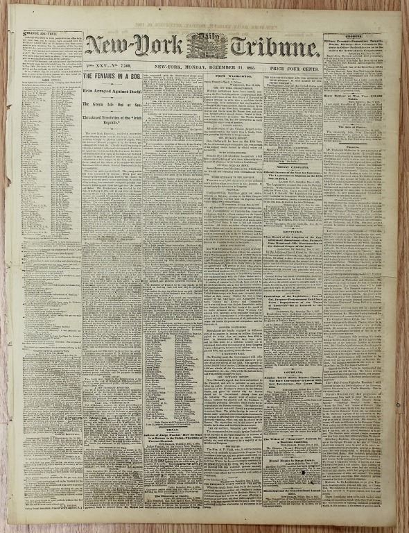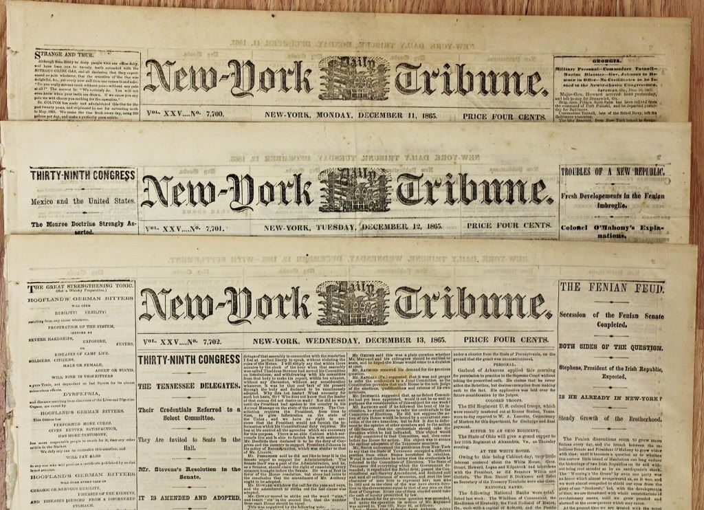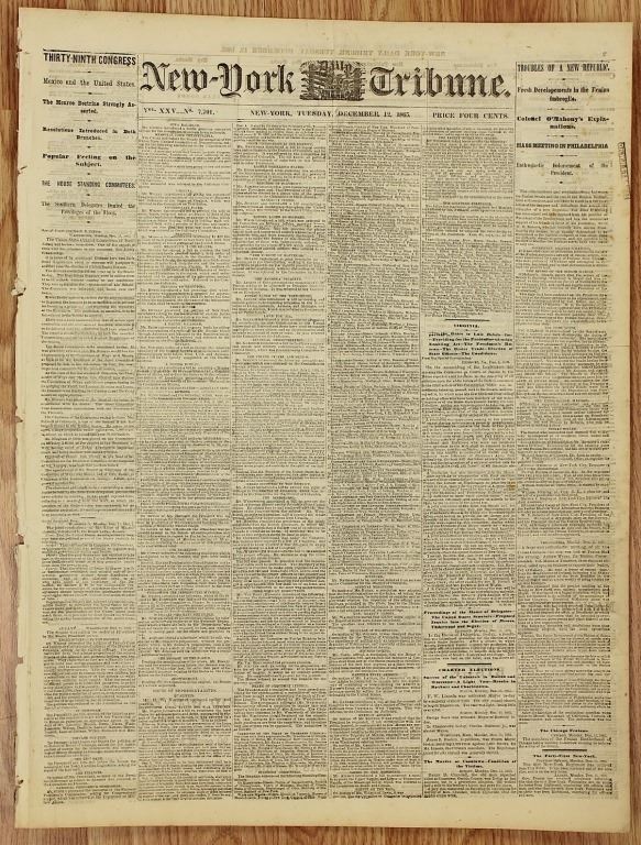 1861-1865. NEW YORK TRIBUNE, 100% AUTHENTIC AND ORIGINAL. WHAT A SUPER CONTENT TO READ! ESTIMATE: $150-$200