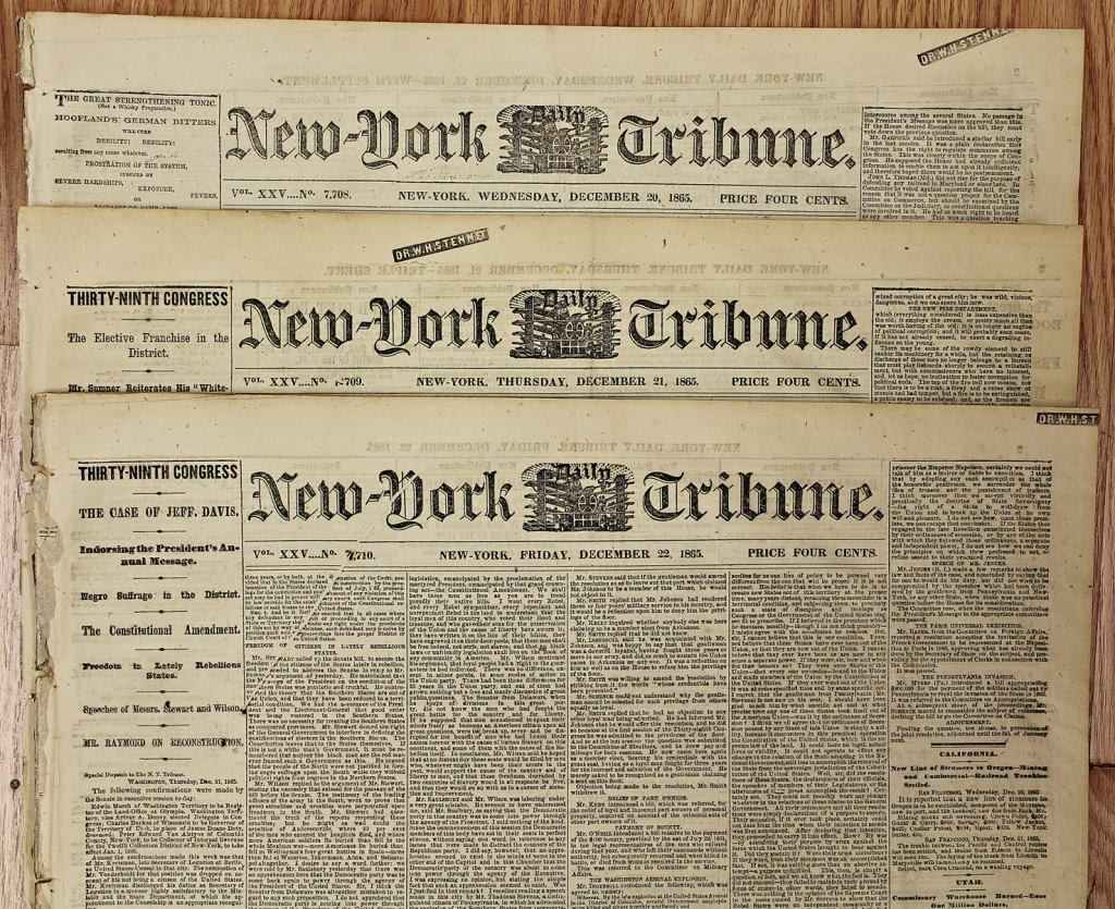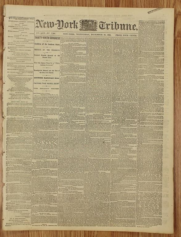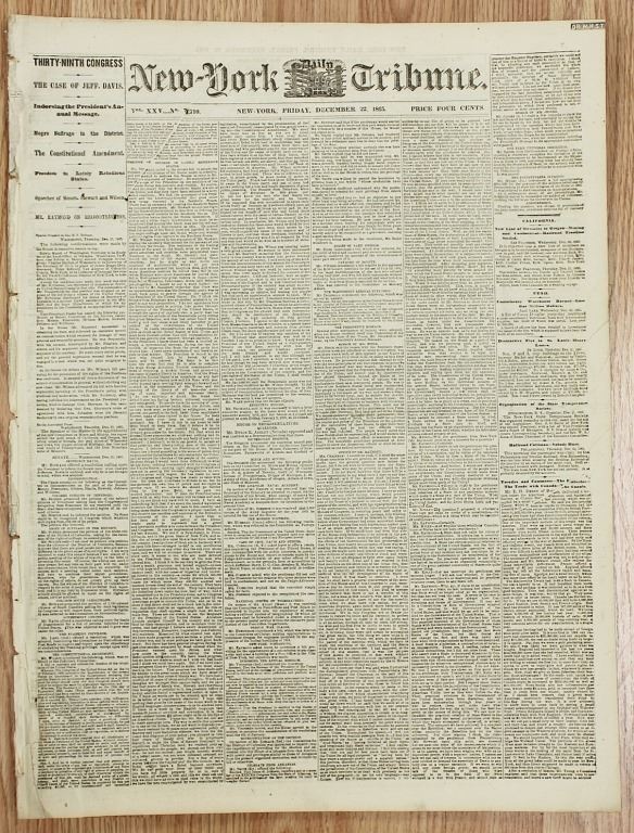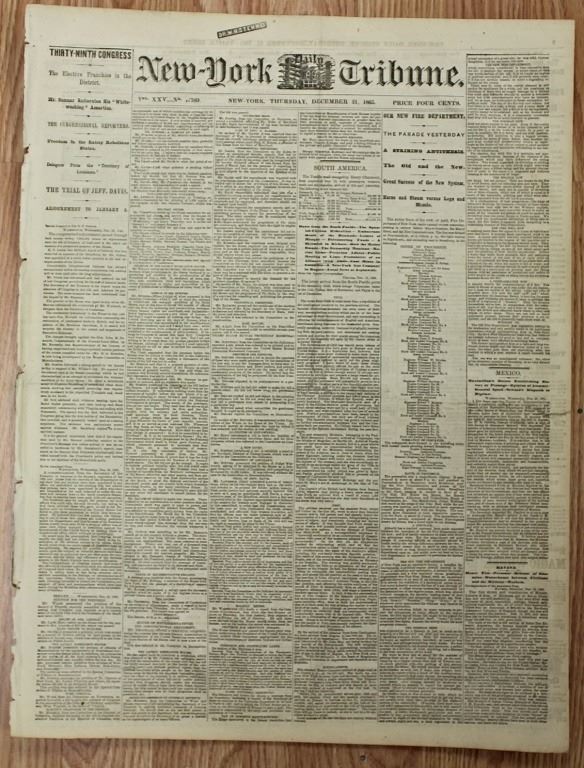 1861-1865. NEW YORK TRIBUNE, 100% AUTHENTIC AND ORIGINAL. WHAT A SUPER CONTENT TO READ! ESTIMATE: $150-$200