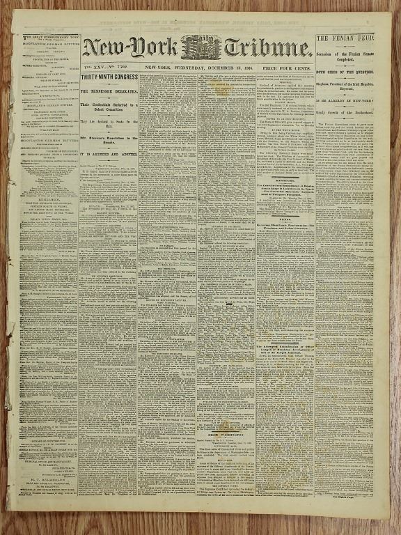 1861-1865. NEW YORK TRIBUNE, 100% AUTHENTIC AND ORIGINAL. WHAT A SUPER CONTENT TO READ! ESTIMATE: $150-$200