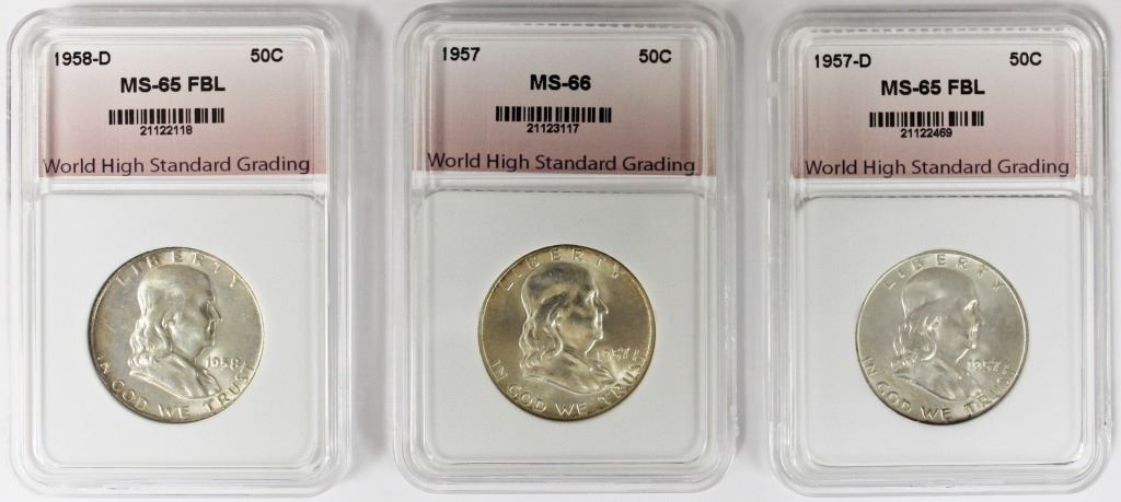 WHSG, GRADED 1957 SUPERB BU, 1957-D GEM BU FULL BELL LINES, 1958-D GEM BU FULL BELL LINES. ESTIMATE: $100-$150