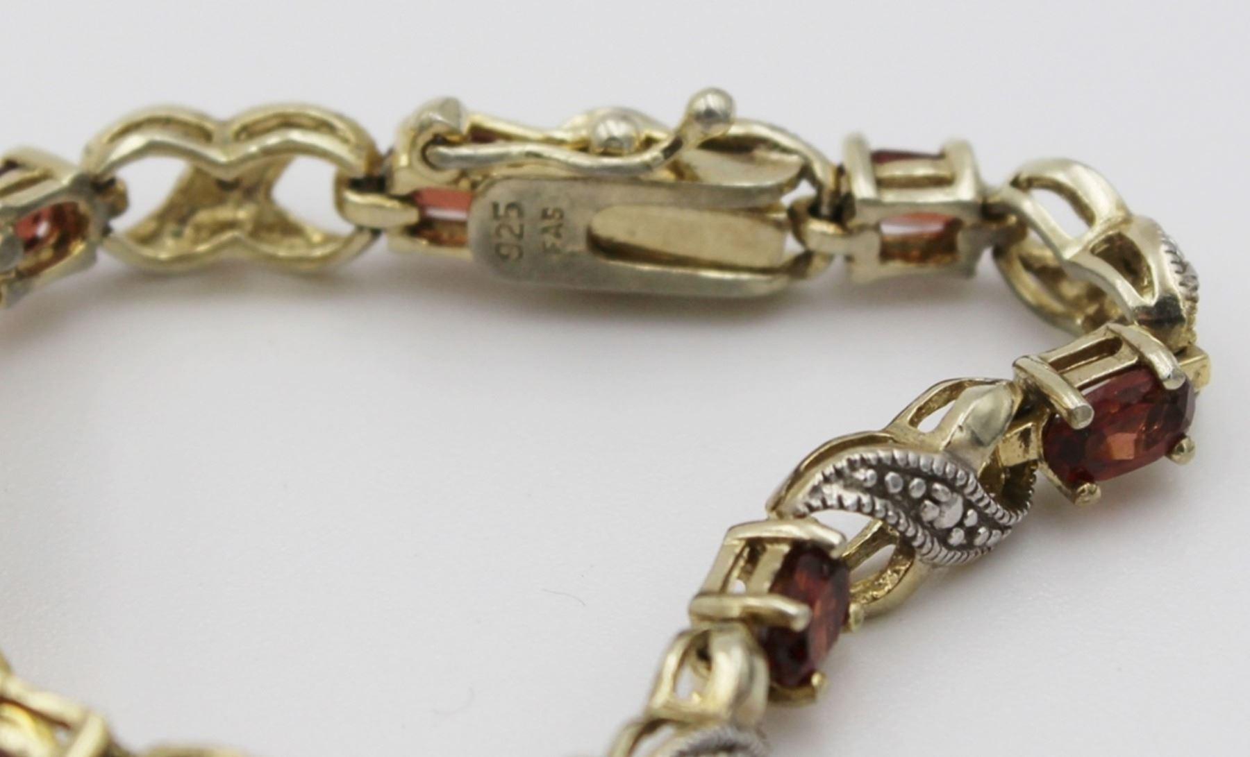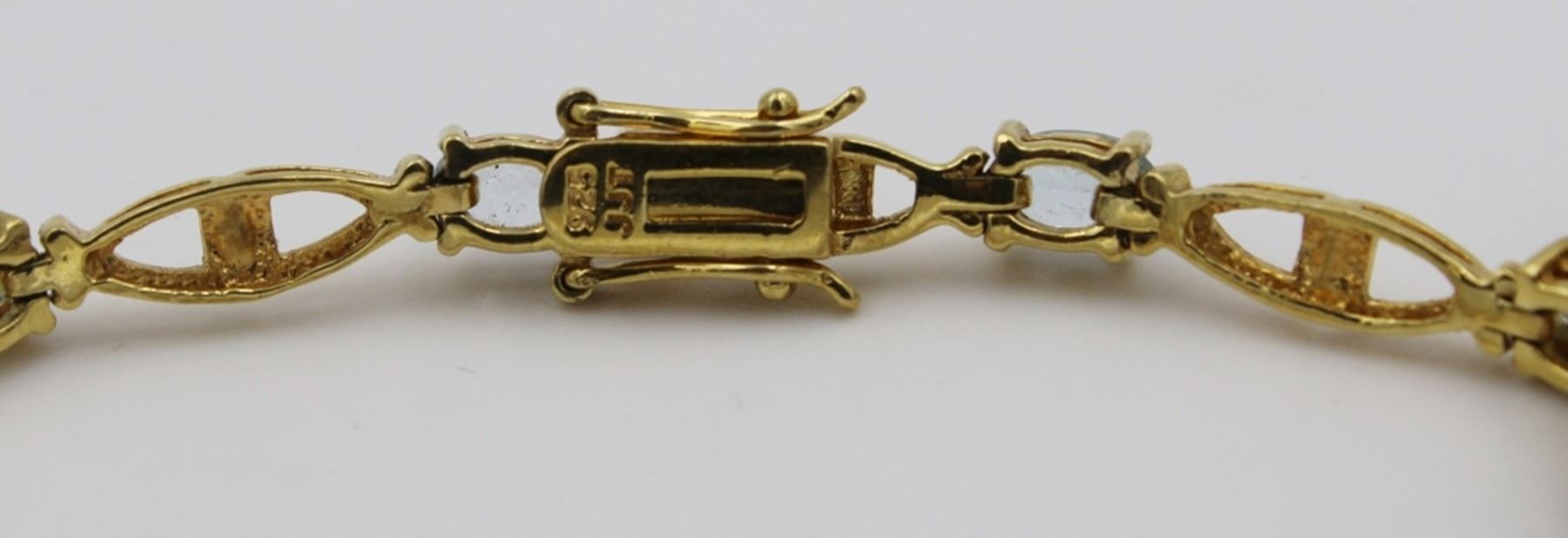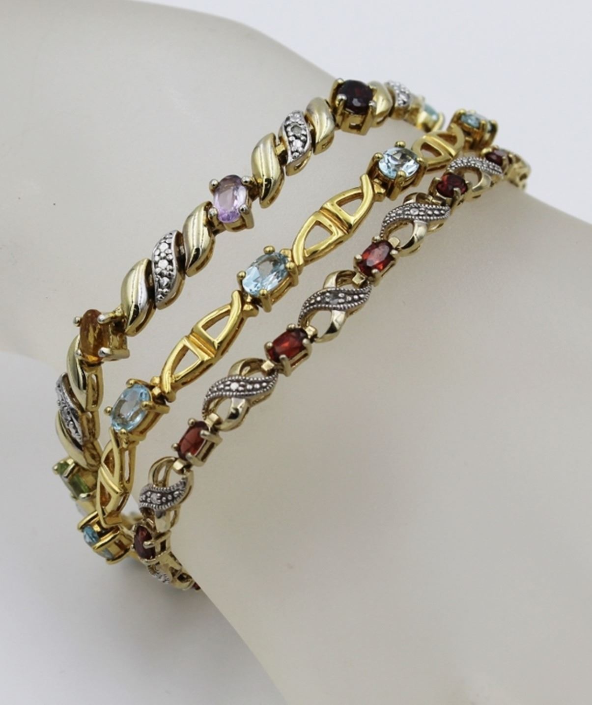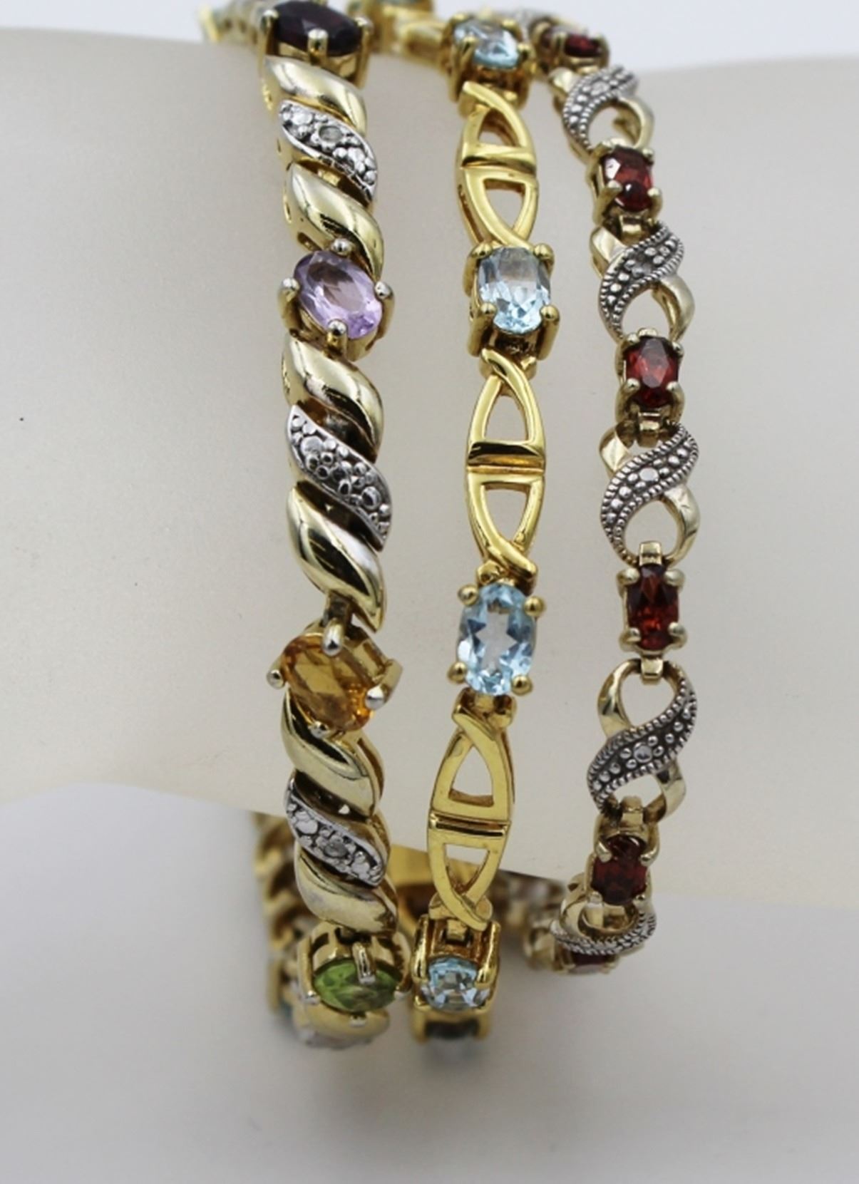 (3) GOLD TONED STERLING SILVER BRACELETS WITH MULTI-COLORED RHINESTONES. ONE HAS GARNET COLORED STONES, ONE HAS AQUAMARINE COLORED STONES AND THE OTHER HAS PURPLE, RED, BLUE, GREEN AND ORANGE COLORED STOMES. PRE-OWNED.