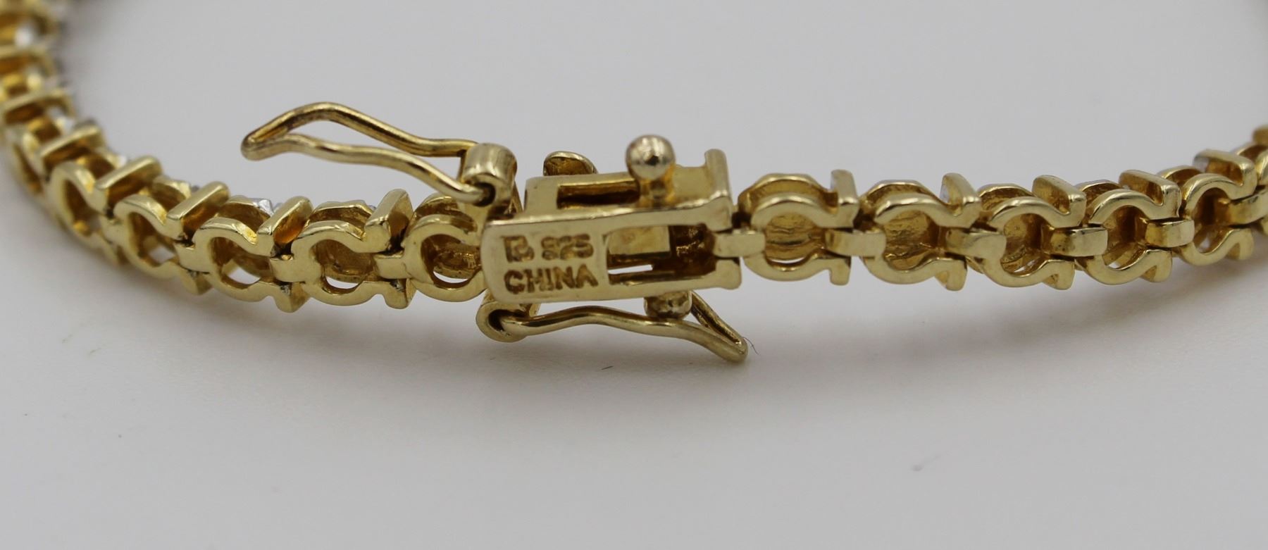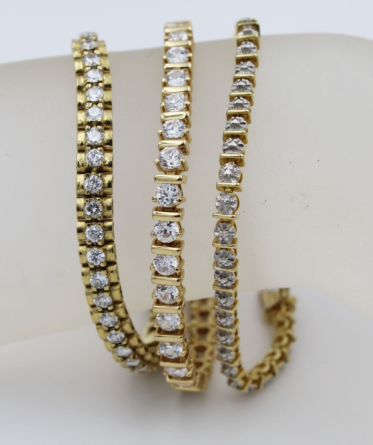 3-GOLD-TONED STERLING SILVER BRACELETS WITH CZS. LENGTH OF ALL 3 IS 7.5". PRE-OWNED. 38.7 GRAMS TOTAL. ESTIMATE: $80-$100