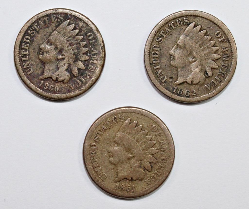 1860 VG; 1861 G-VG; AND 1862 VG-F. ESTIMATE: $60-$85