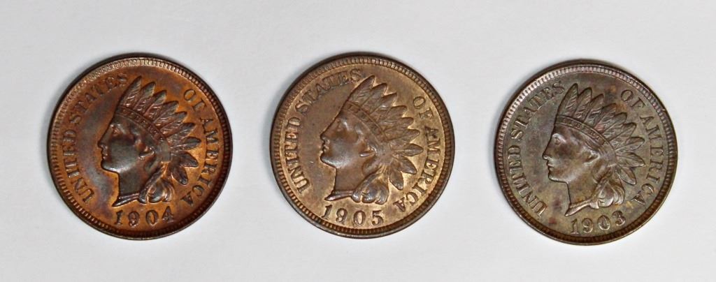 1903 CH BU BROWN, 1904 MS 65 RED BROWN AND 1905 MS 64 RED BROWN. ESTIMATE: $275-$375