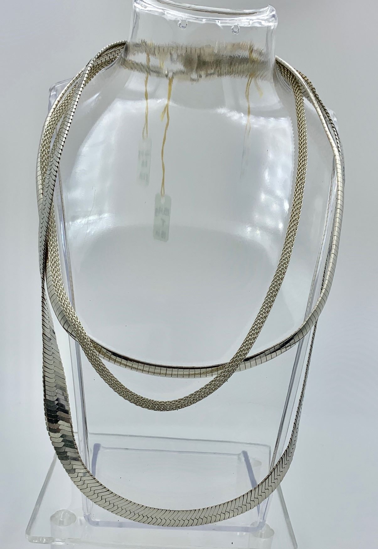 (3) ITALY .925 SILVER CHAINS. ONE 17.5" CHOKER STYLE, ONE 18" ROUNDED CHAIN, AND A 22 INCH THICK HERRINGBONE STYLE CHAIN. 87.2 GRAMS TOTAL. PRE-OWNED. ESTIMATE: $75-$100