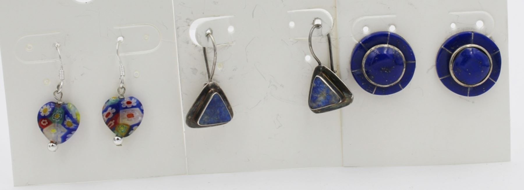 (3) PAIRS OF STERLING SILVER EARRINGS WITH BLUE STONES AND DEATILS. PRE-OWNED. 12.4 GRAMS TOTAL. ESTIMATE: $75-$100