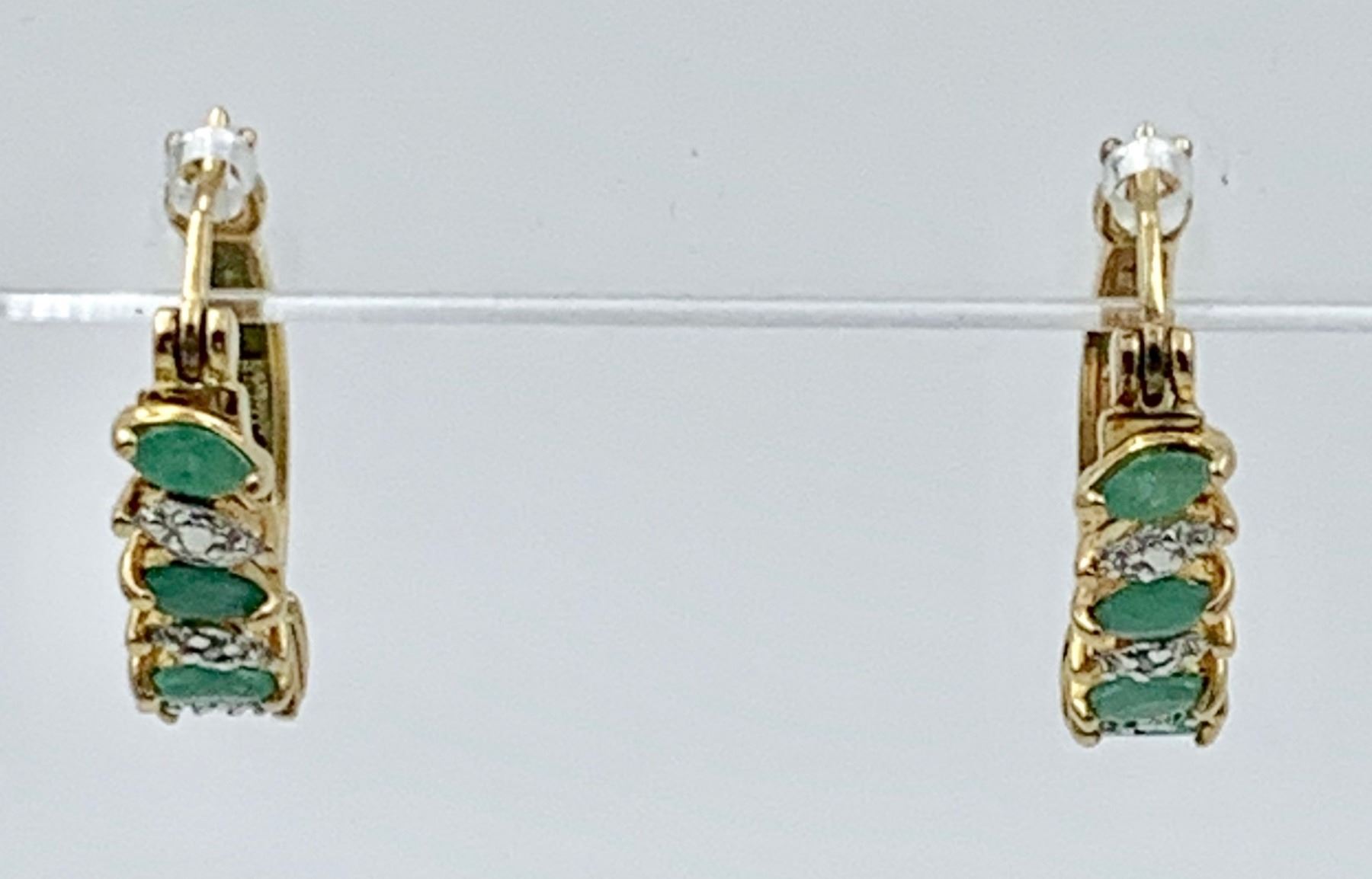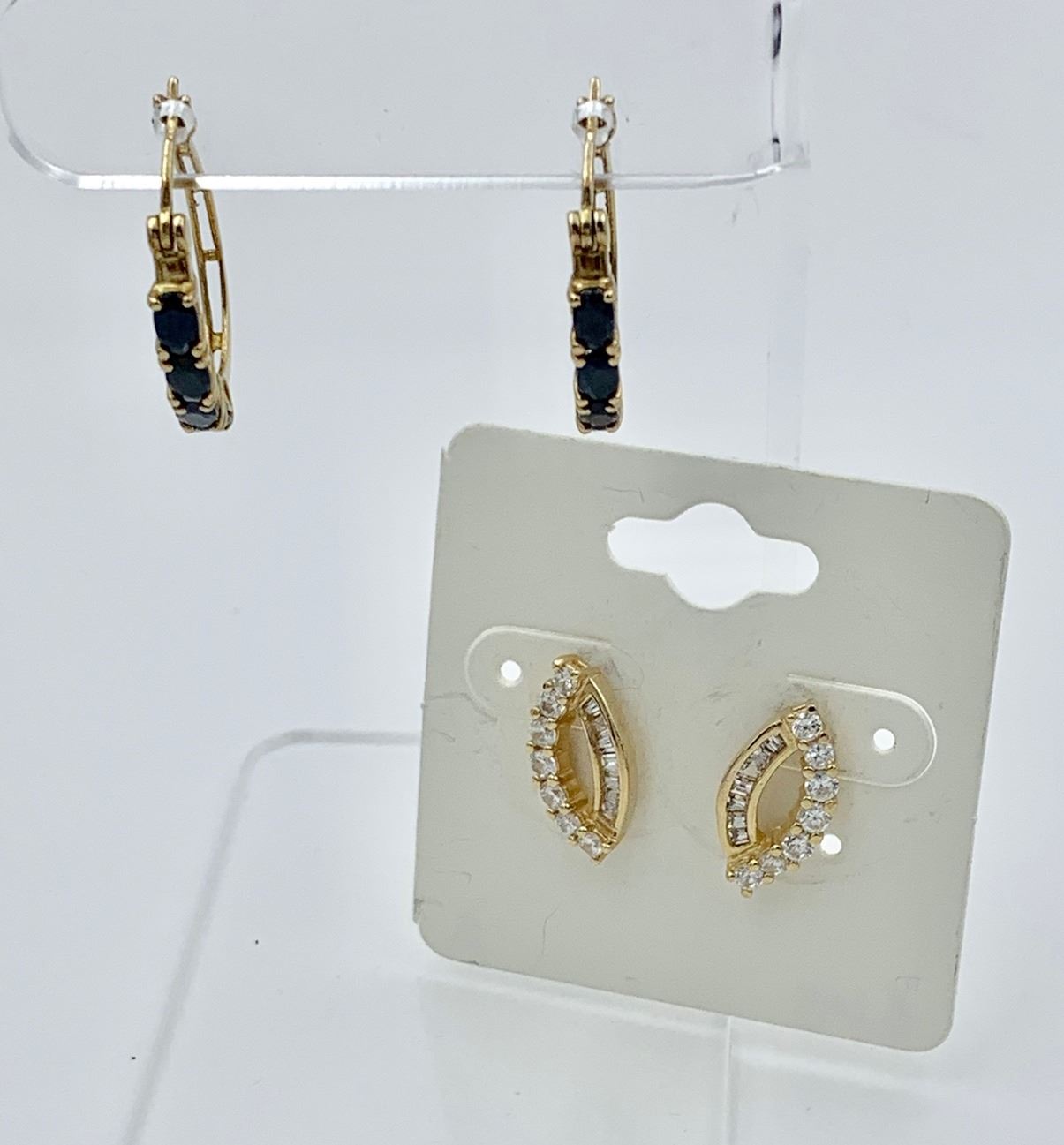 3 PAIRS OF BEAUTIFUL GOLD TONED STERLING SILVER EARRINGS - ONE PAIR OF HOOPS WITH DEEP BLUE GEMSTONES, ONE PAIR OF HOOPS WITH JADE RHINESTONES AND A PAIR WITH ROUND AND RECTANGULAR CZ'S. ALL FOR PIERCED EARS. PRE-OWNED. 11.8 GRAMS TOTAL. ESTIMAET: $75-100