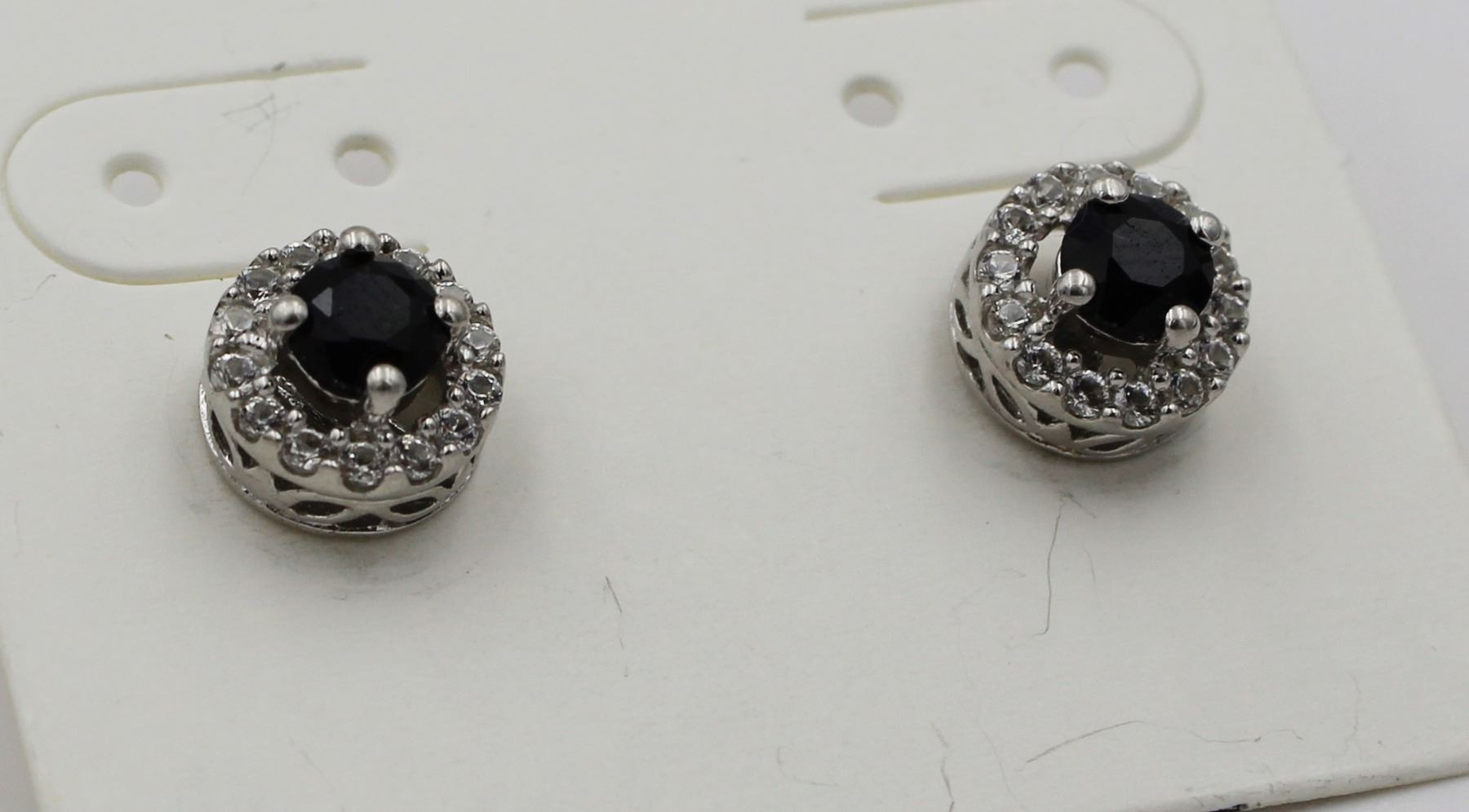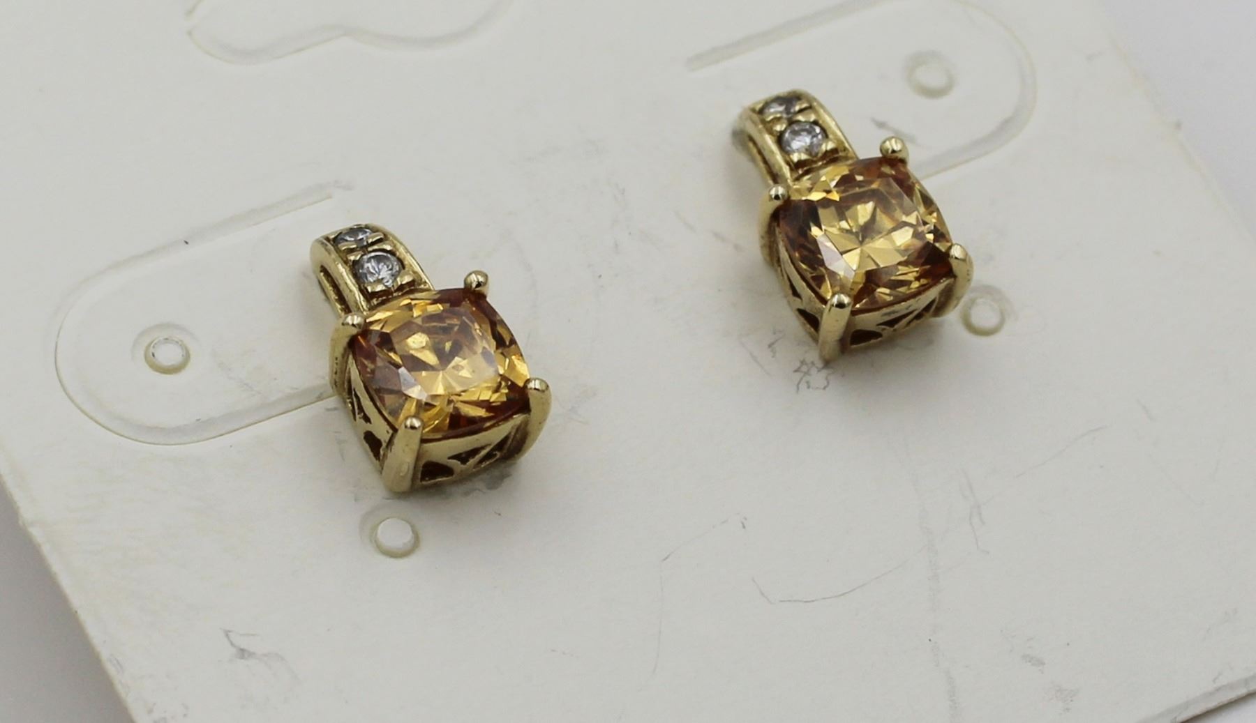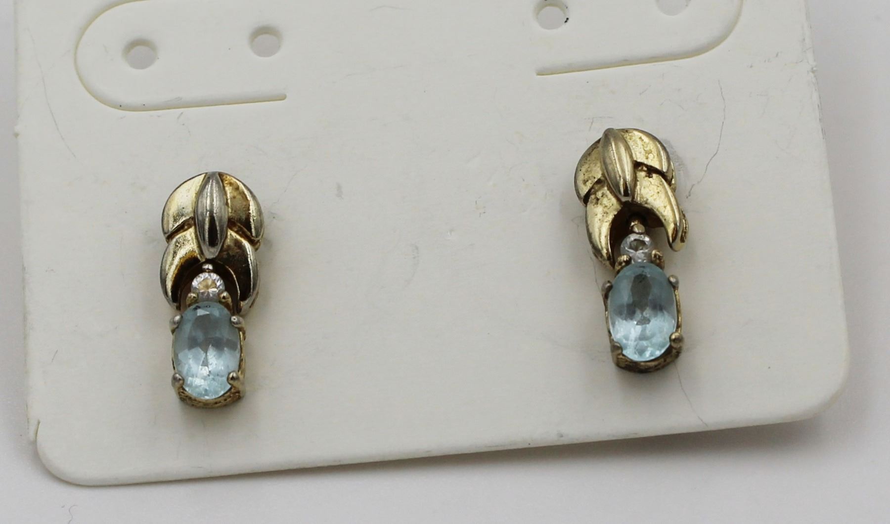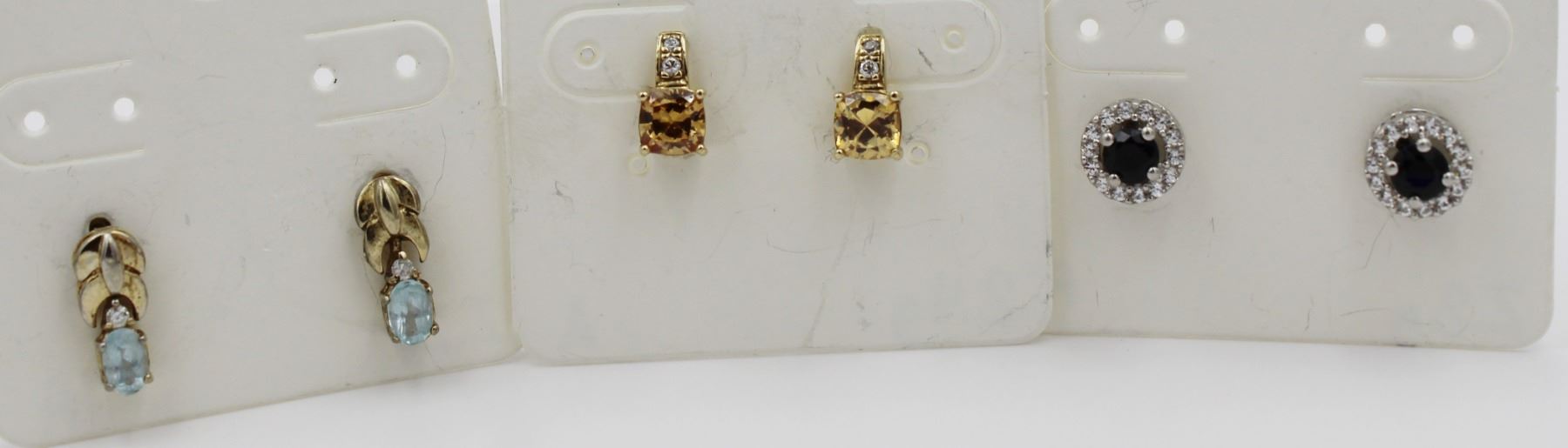 (3) RHINESTONE AND STERLING SILVER EARRINGS. ALL FOR PIERCED EARS. ONE PAIR WITH CZ AND ONYX, ONE WITH DANGLY AQUAMARINE STONES AND GOLD TONED, AND ANOTHER PAIR GOLD TONED AND CITRINE STONE. PRE-OWNED. 7.4 GRAMS TOTAL. ESTIMATE: $50-$60