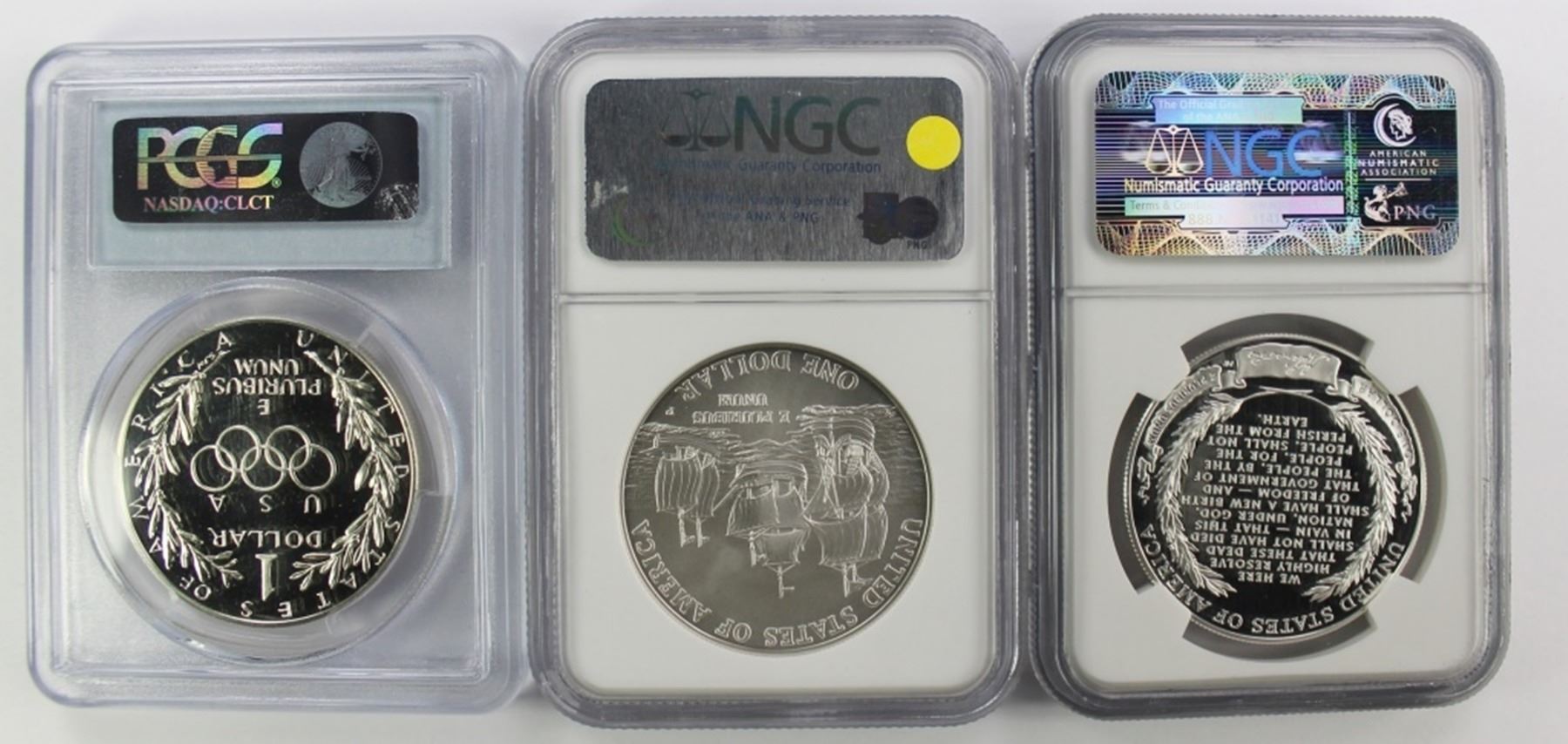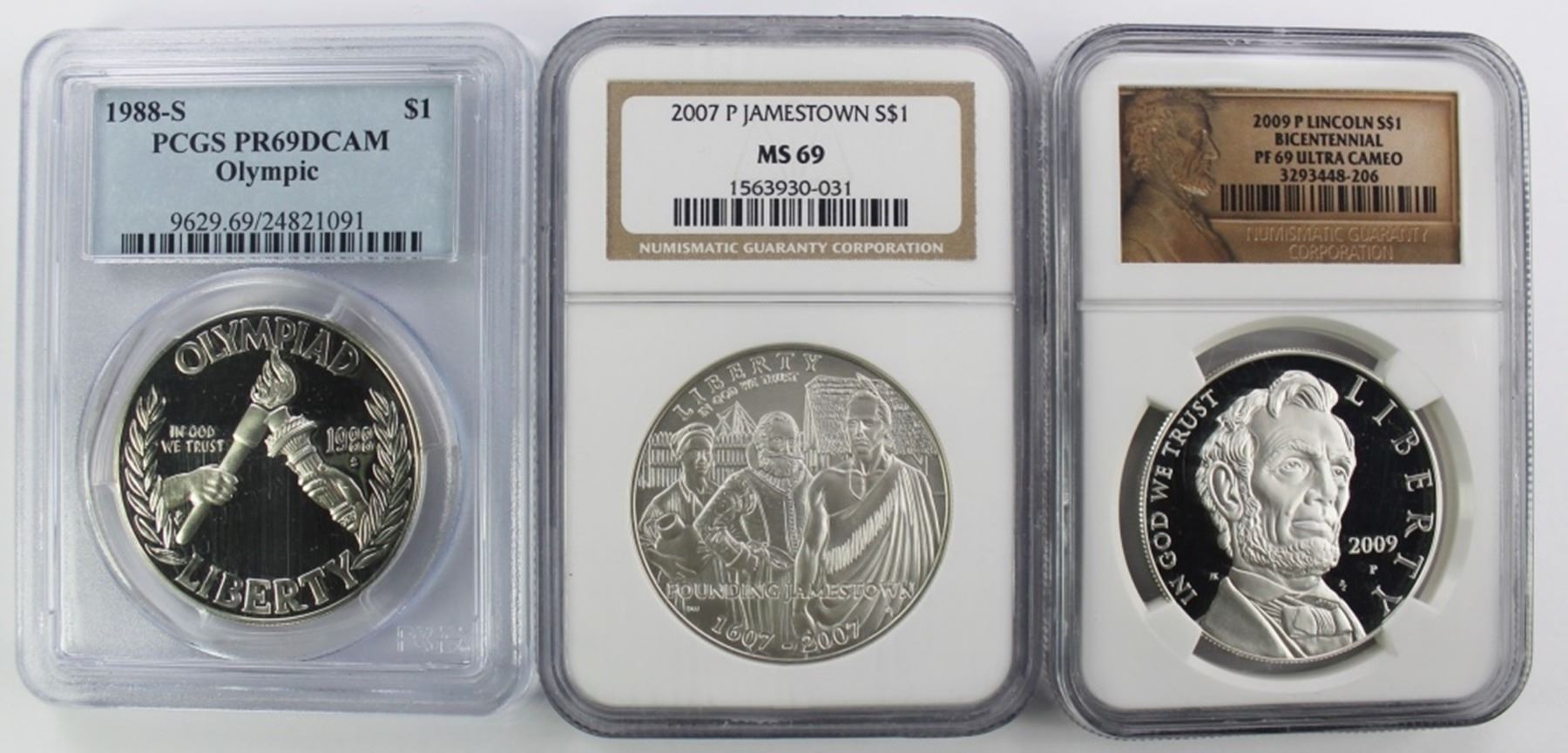 2007 JAMESTOWN SILVER DOLLAR NGC GRADED NS69; 1988-S OLYPIC SILVER DOLLAR PCGS GRADED PR69 D. CAM; 2009-P LINCOLN SILVER DOLLAR NGC GRADED PF69 ULTRA CAMEO.