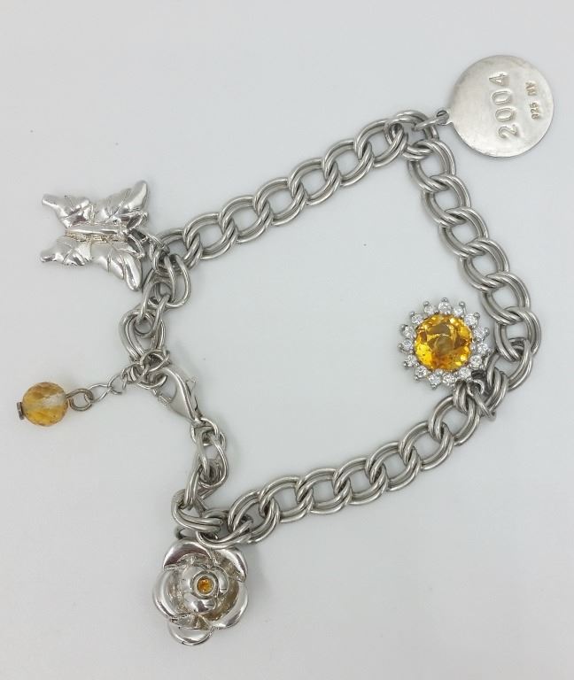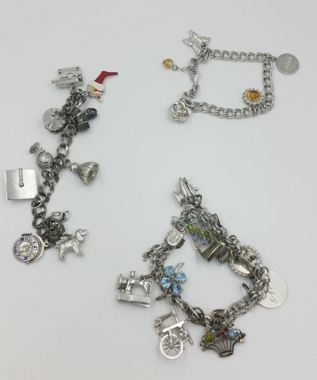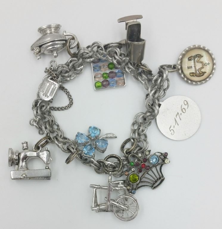 PRE-OWNED, OVER 20 CHARMS - SOME OF THEM ARE: ABACUS, MAGIC LANTERN, SEWING MACHINE, OLD FASHIONED LOOM, TYPEWRITER, MERRY-GO-ROUND, BUTTERFLY AND MANY MORE. SEE PHOTO. 116 GRAMS TOTAL. ESTIMATE: $100-$125