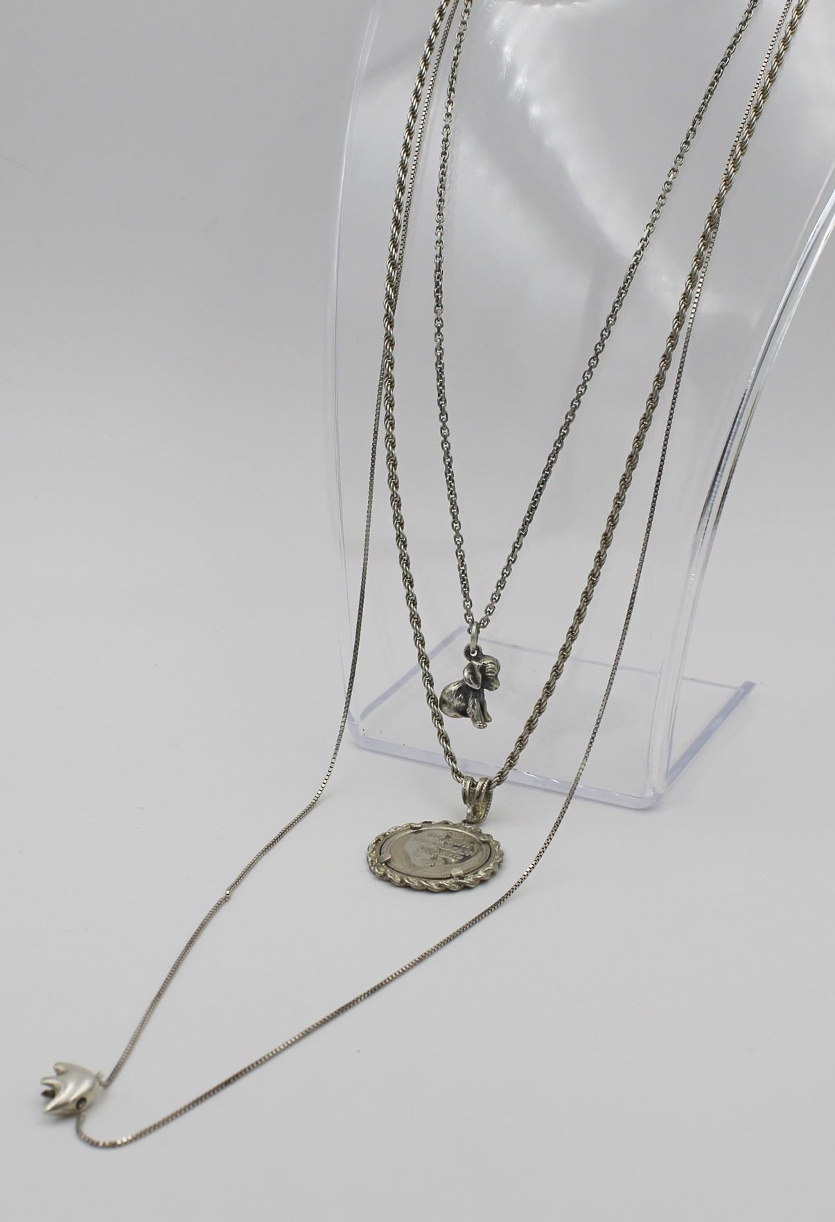 (3) STERLING SILVER NECKLACES - SEE PHOTOS. 20" ITALY .925 WITH GURADIAN ANGEL PENDANT, 30" CHAIN WITH AZTEC BEAR CHARM, 17" CHAIN WITH PUPPY DOG CHARM. PRE-OWNED. 34.2 GRAMS TOTAL. ESTIMATE: $50-$75