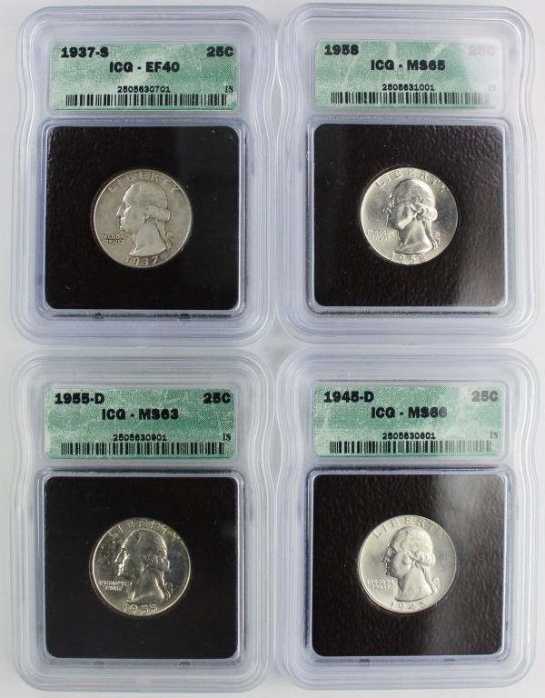1937-S EF 40, 1945-D MS 66, 1955-D MS 63 AND 1958 MS 65. ESTIMATE: $100-$150