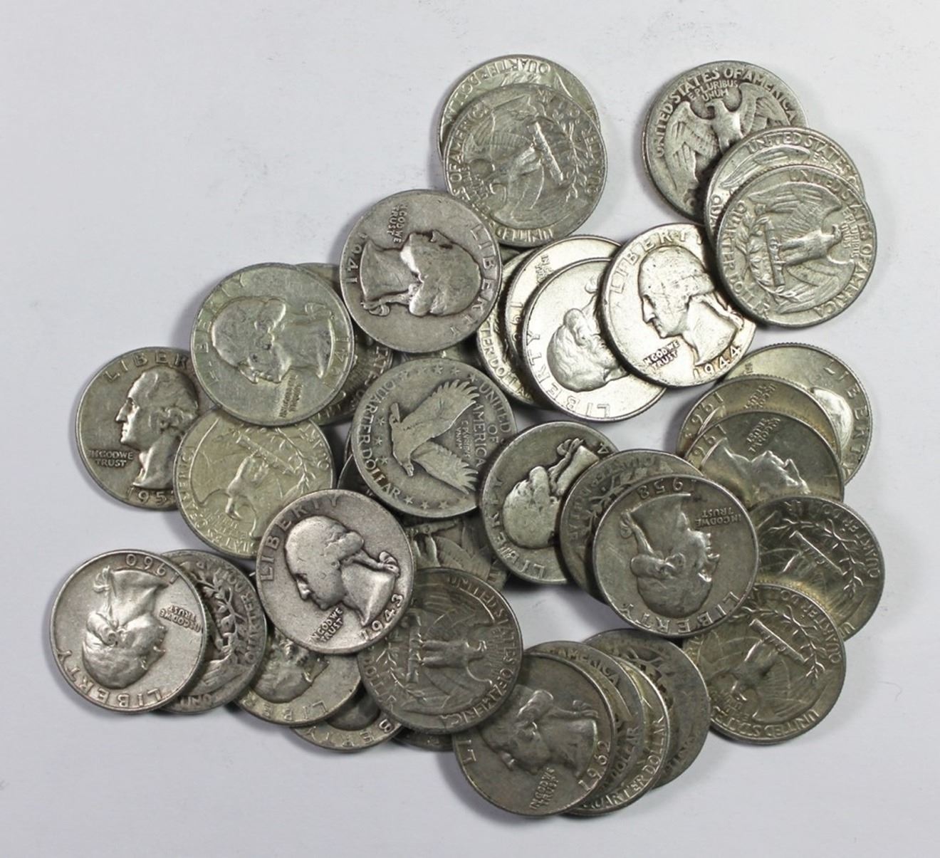 SILVER 1964 AND OLDER. 39 WASHINGTON QUARTERS AND 1 STANDING LIBERTY QUARTER.. ESTIMATE: $225-$275