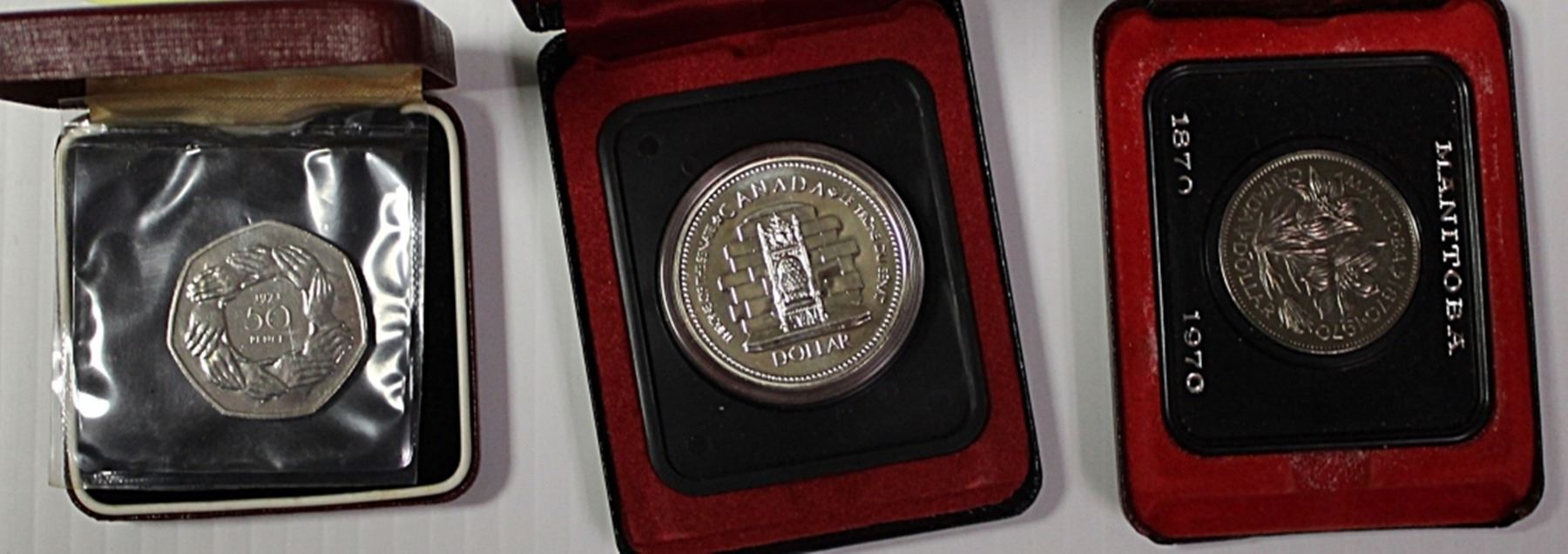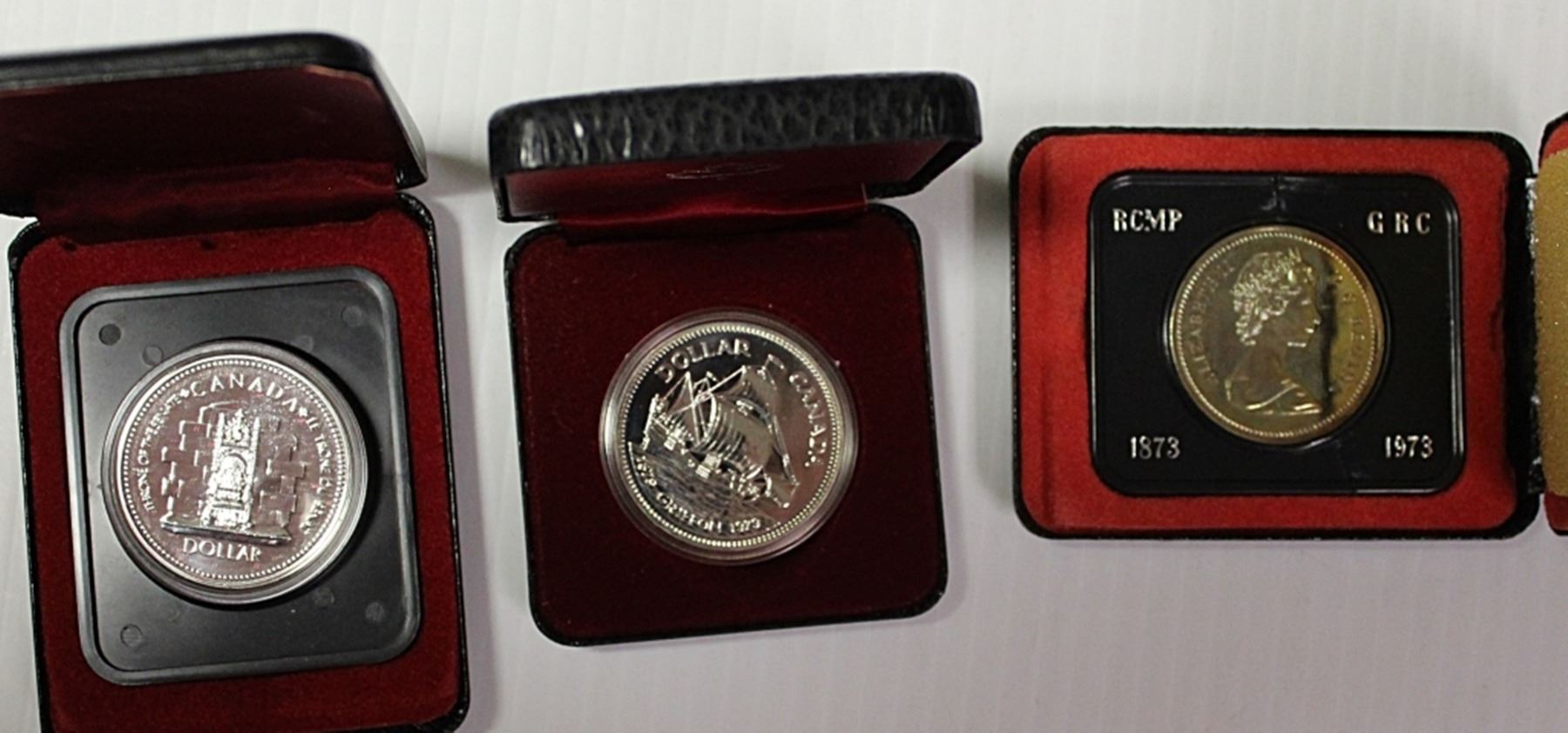 1979 GRIFFON, 1973, 1970 AND (2) 1977 THRONE OF SENATE, PPLUS GREAT BRITAIN 1973 50 PENCE SEALED DOLLAR. 6 COINS TOTAL. ESTIMATE: $55-$85